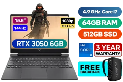 HP Victus Gaming Laptop 15-fa1012ni Intel® Core™ i7-13620H up to 4.9GHz Processor, 24MB Cache, 10x Cores, 16x Threads / 64GB DDR4 RAM / 512GB Ultra-Fast NVME SSD / 15.6" FHD 1920x1080 144Hz Anti-glare IPS-Level Display / RTX 3050 6GB GDDR6 Dedicated Graphics / Windows 11 Home 64bit / Intel Wi-Fi 6E Wireless LAN / Bluetooth 5.3 / 720p HD Camera / 2x USB Type-A / 1x USB Type-C / 1x HDMI 2.1 / 1x Headphone and Microphone Combo Jack / 1x RJ45 Ethernet LAN / 1x SD Card Reader / White Backlit Keyboard / Bang & Olufsen Dual speakers / HP Victus Intel® Core™ i7 RTX 3050 Gaming Laptop DealHP Victus Gaming Laptop 15-fa1012ni Intel® Core™ i7-13620H up to 4.9GHz Processor, 24MB Cache, 10x Cores, 16x Threads / 64GB DDR4 RAM / 512GB Ultra-Fast NVME SSD / 15.6" FHD 1920x1080 144Hz Anti-glare IPS-Level Display / RTX 3050 6GB GDDR6 Dedicated Graphics / Windows 11 Home 64bit / Intel Wi-Fi 6E Wireless LAN / Bluetooth 5.3 / 720p HD Camera / 2x USB Type-A / 1x USB Type-C / 1x HDMI 2.1 / 1x Headphone and Microphone Combo Jack / 1x RJ45 Ethernet LAN / 1x SD Card Reader / White Backlit Keyboard / Bang & Olufsen Dual speakers / HP Victus Intel® Core™ i7 RTX 3050 Gaming Laptop Deal [A19LMEA/64GB] / 3 YEARS WARRANTY / [+] GET FREE EVETECH NEO Premium Gaming Backpack+ FREE DELIVERY !