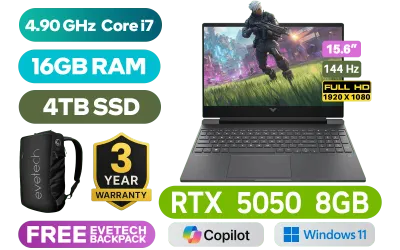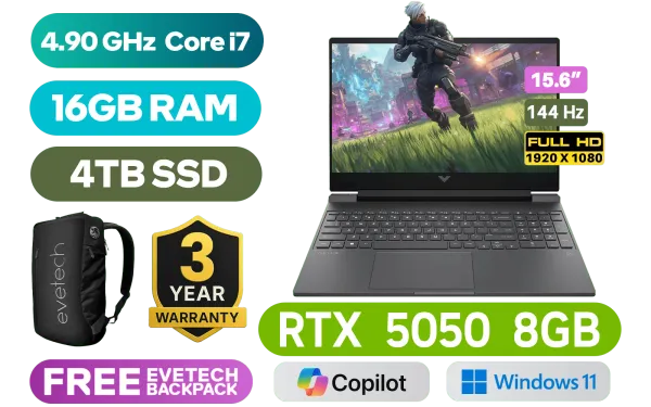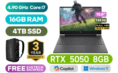 Victus by HP Gaming Laptop 15-fa2018ni 13th Gen Intel® Core⢠i7-13620H up to 4.90GHz Processor, 24MB Cache, 10x Cores, 16x Threads / 16GB DDR5 RAM / 4TB Ultra-Fast NVME SSD / 15.6" FHD (1920x1080) Anti-glare 144Hz Refresh Rate with IPS-Level micro-edge Display / NVIDIA GeForce RTX 5050 8GB GDDR7 Dedicated Graphics / Windows 11 Home 64bit / Realtek Wi-Fi 6 8852BE Wireless LAN / Bluetooth 5.4 / HP Wide Vision 720p Camera with Integrated Dual Array Digital Microphone / 2x USB Type-A / 1x USB Type-C / 1x HDMI 2.1 / 1x Headphone and Microphone Combo Jack / 1x RJ45 / White Backlit Keyboard / DTS:X® Ultra; Dual speakers; HP Audio Boost / HP Victus 15 Intel Core i7 RTX 5050 Gaming Laptop DealVictus by HP Gaming Laptop 15-fa2018ni 13th Gen Intel® Core⢠i7-13620H up to 4.90GHz Processor, 24MB Cache, 10x Cores, 16x Threads / 16GB DDR5 RAM / 4TB Ultra-Fast NVME SSD / 15.6" FHD (1920x1080) Anti-glare 144Hz Refresh Rate with IPS-Level micro-edge Display / NVIDIA GeForce RTX 5050 8GB GDDR7 Dedicated Graphics / Windows 11 Home 64bit / Realtek Wi-Fi 6 8852BE Wireless LAN / Bluetooth 5.4 / HP Wide Vision 720p Camera with Integrated Dual Array Digital Microphone / 2x USB Type-A / 1x USB Type-C / 1x HDMI 2.1 / 1x Headphone and Microphone Combo Jack / 1x RJ45 / White Backlit Keyboard / DTS:X® Ultra; Dual speakers; HP Audio Boost / HP Victus 15 Intel Core i7 RTX 5050 Gaming Laptop Deal [BP5Q2EA/16GB/4TB] / [+] GET FREE EVETECH NEO Premium Gaming Backpack / 3 YEARS WARRANTY + FREE DELIVERY !