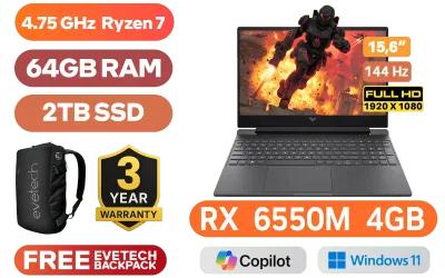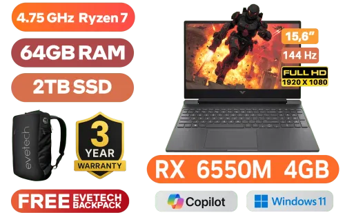 Victus by HP Laptop 15-fb2003ni AMD Ryzen™ 7 7735HS up to 4.75 GHz Processor, 20MB Cache, 8x Cores, 16x Threads / 64GB DDR5 RAM / 2TB Ultra-Fast NVME SSD / 15.6" FHD 1920x1080 144Hz Anti-glare IPS-Level Display / AMD Radeon™ RX 6550M 4GB GDDR6 Dedicated Graphics / Windows 11 Home 64bit / Realtek Wi-Fi 6 RTL8852BE Wireless LAN / Bluetooth 5.3 / 720p HD Camera / 2x USB Type-A / 1x USB Type-C / 1x HDMI 2.1 / 1x Headphone and Microphone Combo Jack / 1x RJ45 Ethernet LAN / 1x SD Card Reader / White Backlit Keyboard / Bang & Olufsen Dual speakers / HP Victus 15 Ryzen 7 RX 6550 Gaming Laptop DealVictus by HP Laptop 15-fb2003ni AMD Ryzen™ 7 7735HS up to 4.75 GHz Processor, 20MB Cache, 8x Cores, 16x Threads / 64GB DDR5 RAM / 2TB Ultra-Fast NVME SSD / 15.6" FHD 1920x1080 144Hz Anti-glare IPS-Level Display / AMD Radeon™ RX 6550M 4GB GDDR6 Dedicated Graphics / Windows 11 Home 64bit / Realtek Wi-Fi 6 RTL8852BE Wireless LAN / Bluetooth 5.3 / 720p HD Camera / 2x USB Type-A / 1x USB Type-C / 1x HDMI 2.1 / 1x Headphone and Microphone Combo Jack / 1x RJ45 Ethernet LAN / 1x SD Card Reader / White Backlit Keyboard / Bang & Olufsen Dual speakers / HP Victus 15 Ryzen 7 RX 6550 Gaming Laptop Deal [A73T8EA/64GB/2TB] / 3 YEARS WARRANTY / [+] GET FREE EVETECH NEO Premium Gaming Backpack+ FREE DELIVERY !