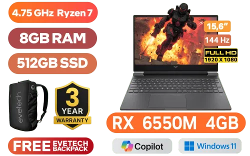Victus by HP Laptop 15-fb2003ni AMD Ryzen™ 7 7735HS up to 4.75GHz Processor, 20MB Cache, 8x Cores, 16x Threads / 8GB DDR5 RAM / 512GB Ultra-Fast NVME SSD / 15.6" FHD 1920x1080 144Hz Anti-glare IPS-Level Display / AMD Radeon™ RX 6550M 4GB GDDR6 Dedicated Graphics / Windows 11 Home 64bit / Realtek Wi-Fi 6 RTL8852BE Wireless LAN / Bluetooth 5.3 / 720p HD Camera / 2x USB Type-A / 1x USB Type-C / 1x HDMI 2.1 / 1x Headphone and Microphone Combo Jack / 1x RJ45 Ethernet LAN / 1x SD Card Reader / White Backlit Keyboard / Bang & Olufsen Dual speakers / HP Victus 15 Ryzen 7 RX 6550 Gaming Laptop DealVictus by HP Laptop 15-fb2003ni AMD Ryzen™ 7 7735HS up to 4.75GHz Processor, 20MB Cache, 8x Cores, 16x Threads / 8GB DDR5 RAM / 512GB Ultra-Fast NVME SSD / 15.6" FHD 1920x1080 144Hz Anti-glare IPS-Level Display / AMD Radeon™ RX 6550M 4GB GDDR6 Dedicated Graphics / Windows 11 Home 64bit / Realtek Wi-Fi 6 RTL8852BE Wireless LAN / Bluetooth 5.3 / 720p HD Camera / 2x USB Type-A / 1x USB Type-C / 1x HDMI 2.1 / 1x Headphone and Microphone Combo Jack / 1x RJ45 Ethernet LAN / 1x SD Card Reader / White Backlit Keyboard / Bang & Olufsen Dual speakers / HP Victus 15 Ryzen 7 RX 6550 Gaming Laptop Deal [A73T8EA] / 3 YEARS WARRANTY / [+] GET FREE EVETECH NEO Premium Gaming Backpack+ FREE DELIVERY !