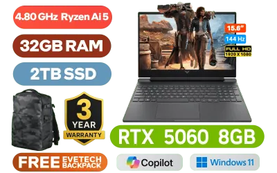 Victus by HP Gaming Laptop 15-fb3001ni AMD Ryzen™ AI 5 340 up to 4.80GHz Processor, 22MB Cache, 6x Cores, 12x Threads / 32GB DDR5 RAM / 2TB Ultra-Fast NVME SSD / 15.6" FHD (1920x1080) Anti-glare 144Hz Refresh Rate with IPS-Level micro-edge Display / NVIDIA GeForce RTX 5060 8GB GDDR7 Dedicated Graphics / Windows 11 Home 64bit / Realtek Wi-Fi 6 8852BE Wireless LAN / Bluetooth 5.4 / HP True Vision 1080p FHD IR Camera with Integrated Dual Array Digital Microphone / 2x USB Type-A / 1x USB Type-C / 1x HDMI 2.1 / 1x Headphone and Microphone Combo Jack / 1x RJ45 / White Backlit Keyboard / DTS:X® Ultra; Dual speakers; HP Audio Boost / HP Victus 15 Ryzen AI 5 340 RTX 5060 Gaming Laptop DealVictus by HP Gaming Laptop 15-fb3001ni AMD Ryzen™ AI 5 340 up to 4.80GHz Processor, 22MB Cache, 6x Cores, 12x Threads / 32GB DDR5 RAM / 2TB Ultra-Fast NVME SSD / 15.6" FHD (1920x1080) Anti-glare 144Hz Refresh Rate with IPS-Level micro-edge Display / NVIDIA GeForce RTX 5060 8GB GDDR7 Dedicated Graphics / Windows 11 Home 64bit / Realtek Wi-Fi 6 8852BE Wireless LAN / Bluetooth 5.4 / HP True Vision 1080p FHD IR Camera with Integrated Dual Array Digital Microphone / 2x USB Type-A / 1x USB Type-C / 1x HDMI 2.1 / 1x Headphone and Microphone Combo Jack / 1x RJ45 / White Backlit Keyboard / DTS:X® Ultra; Dual speakers; HP Audio Boost / HP Victus 15 Ryzen AI 5 340 RTX 5060 Gaming Laptop Deal [BP5Q4EA/32GB/2TB] / 3 YEARS WARRANTY / [+] GET FREE EVETECH DASH Premium Gaming Backpack+ FREE DELIVERY !