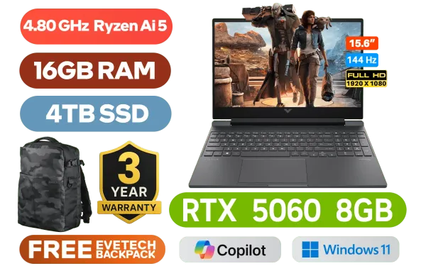 Victus by HP Gaming Laptop 15-fb3001ni AMD Ryzen™ AI 5 340 up to 4.80GHz Processor, 22MB Cache, 6x Cores, 12x Threads / 16GB DDR5 RAM / 4TB Ultra-Fast NVME SSD / 15.6" FHD (1920x1080) Anti-glare 144Hz Refresh Rate with IPS-Level micro-edge Display / NVIDIA GeForce RTX 5060 8GB GDDR7 Dedicated Graphics / Windows 11 Home 64bit / Realtek Wi-Fi 6 8852BE Wireless LAN / Bluetooth 5.4 / HP True Vision 1080p FHD IR Camera with Integrated Dual Array Digital Microphone / 2x USB Type-A / 1x USB Type-C / 1x HDMI 2.1 / 1x Headphone and Microphone Combo Jack / 1x RJ45 / White Backlit Keyboard / DTS:X® Ultra; Dual speakers; HP Audio Boost / HP Victus 15 Ryzen AI 5 340 RTX 5060 Gaming Laptop DealVictus by HP Gaming Laptop 15-fb3001ni AMD Ryzen™ AI 5 340 up to 4.80GHz Processor, 22MB Cache, 6x Cores, 12x Threads / 16GB DDR5 RAM / 4TB Ultra-Fast NVME SSD / 15.6" FHD (1920x1080) Anti-glare 144Hz Refresh Rate with IPS-Level micro-edge Display / NVIDIA GeForce RTX 5060 8GB GDDR7 Dedicated Graphics / Windows 11 Home 64bit / Realtek Wi-Fi 6 8852BE Wireless LAN / Bluetooth 5.4 / HP True Vision 1080p FHD IR Camera with Integrated Dual Array Digital Microphone / 2x USB Type-A / 1x USB Type-C / 1x HDMI 2.1 / 1x Headphone and Microphone Combo Jack / 1x RJ45 / White Backlit Keyboard / DTS:X® Ultra; Dual speakers; HP Audio Boost / HP Victus 15 Ryzen AI 5 340 RTX 5060 Gaming Laptop Deal [BP5Q4EA/4TB] / 3 YEARS WARRANTY / [+] GET FREE EVETECH DASH Premium Gaming Backpack+ FREE DELIVERY !