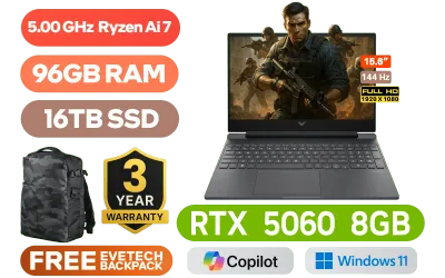 Victus by HP Gaming Laptop 15-fb3000ni AMD Ryzen™ AI 7 350 up to 5.00GHz Processor, 24MB Cache, 8x Cores, 16x Threads / 96GB DDR5 RAM / 16TB Ultra-Fast NVME SSD / 15.6" FHD (1920x1080) Anti-glare 144Hz Refresh Rate with IPS-Level micro-edge Display / NVIDIA GeForce RTX 5060 8GB GDDR7 Dedicated Graphics / Windows 11 Home 64bit / Realtek Wi-Fi 6 8852BE Wireless LAN / Bluetooth 5.4 / HP True Vision 1080p FHD IR Camera with Integrated Dual Array Digital Microphone / 2x USB Type-A / 1x USB Type-C / 1x HDMI 2.1 / 1x Headphone and Microphone Combo Jack / 1x RJ45 / White Backlit Keyboard / DTS:X® Ultra; Dual speakers; HP Audio Boost / HP Victus 15 Ryzen AI 7 350 RTX 5060 Gaming Laptop DealVictus by HP Gaming Laptop 15-fb3000ni AMD Ryzen™ AI 7 350 up to 5.00GHz Processor, 24MB Cache, 8x Cores, 16x Threads / 96GB DDR5 RAM / 16TB Ultra-Fast NVME SSD / 15.6" FHD (1920x1080) Anti-glare 144Hz Refresh Rate with IPS-Level micro-edge Display / NVIDIA GeForce RTX 5060 8GB GDDR7 Dedicated Graphics / Windows 11 Home 64bit / Realtek Wi-Fi 6 8852BE Wireless LAN / Bluetooth 5.4 / HP True Vision 1080p FHD IR Camera with Integrated Dual Array Digital Microphone / 2x USB Type-A / 1x USB Type-C / 1x HDMI 2.1 / 1x Headphone and Microphone Combo Jack / 1x RJ45 / White Backlit Keyboard / DTS:X® Ultra; Dual speakers; HP Audio Boost / HP Victus 15 Ryzen AI 7 350 RTX 5060 Gaming Laptop Deal [BP5Q3EA/96GB/16TB] / 3 YEARS WARRANTY / [+] GET FREE Evetech VR Gaming Mousepad / [+] GET FREE EVETECH DASH Premium Gaming Backpack+ FREE DELIVERY !