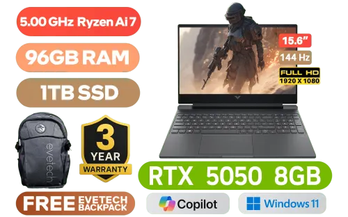 Victus by HP Gaming Laptop 15-fb3002ni AMD Ryzen™ AI 7 350 up to 5.00GHz Processor, 24MB Cache, 8x Cores, 16x Threads / 96GB DDR5 RAM / 1TB Ultra-Fast NVME SSD / 15.6" FHD (1920x1080) Anti-glare 144Hz Refresh Rate with IPS-Level micro-edge Display / NVIDIA GeForce RTX 5050 8GB GDDR7 Dedicated Graphics / Windows 11 Home 64bit / Realtek Wi-Fi 6 8852BE Wireless LAN / Bluetooth 5.4 / HP True Vision 1080p FHD IR Camera with Integrated Dual Array Digital Microphone / 2x USB Type-A / 1x USB Type-C / 1x HDMI 2.1 / 1x Headphone and Microphone Combo Jack / 1x RJ45 / White Backlit Keyboard / DTS:X® Ultra; Dual speakers; HP Audio Boost / HP Victus 15 Ryzen AI 7 350 RTX 5050 Gaming Laptop DealVictus by HP Gaming Laptop 15-fb3002ni AMD Ryzen™ AI 7 350 up to 5.00GHz Processor, 24MB Cache, 8x Cores, 16x Threads / 96GB DDR5 RAM / 1TB Ultra-Fast NVME SSD / 15.6" FHD (1920x1080) Anti-glare 144Hz Refresh Rate with IPS-Level micro-edge Display / NVIDIA GeForce RTX 5050 8GB GDDR7 Dedicated Graphics / Windows 11 Home 64bit / Realtek Wi-Fi 6 8852BE Wireless LAN / Bluetooth 5.4 / HP True Vision 1080p FHD IR Camera with Integrated Dual Array Digital Microphone / 2x USB Type-A / 1x USB Type-C / 1x HDMI 2.1 / 1x Headphone and Microphone Combo Jack / 1x RJ45 / White Backlit Keyboard / DTS:X® Ultra; Dual speakers; HP Audio Boost / HP Victus 15 Ryzen AI 7 350 RTX 5050 Gaming Laptop Deal [BP5Q5EA/96GB] / 3 YEARS WARRANTY / [+] GET FREE EVETECH FLUX Premium Gaming Backpack+ FREE DELIVERY !