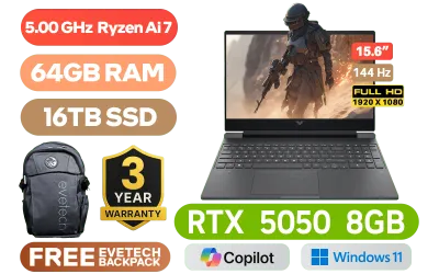 Victus by HP Gaming Laptop 15-fb3002ni AMD Ryzen™ AI 7 350 up to 5.00GHz Processor, 24MB Cache, 8x Cores, 16x Threads / 64GB DDR5 RAM / 16TB Ultra-Fast NVME SSD / 15.6" FHD (1920x1080) Anti-glare 144Hz Refresh Rate with IPS-Level micro-edge Display / NVIDIA GeForce RTX 5050 8GB GDDR7 Dedicated Graphics / Windows 11 Home 64bit / Realtek Wi-Fi 6 8852BE Wireless LAN / Bluetooth 5.4 / HP True Vision 1080p FHD IR Camera with Integrated Dual Array Digital Microphone / 2x USB Type-A / 1x USB Type-C / 1x HDMI 2.1 / 1x Headphone and Microphone Combo Jack / 1x RJ45 / White Backlit Keyboard / DTS:X® Ultra; Dual speakers; HP Audio Boost / HP Victus 15 Ryzen AI 7 350 RTX 5050 Gaming Laptop DealVictus by HP Gaming Laptop 15-fb3002ni AMD Ryzen™ AI 7 350 up to 5.00GHz Processor, 24MB Cache, 8x Cores, 16x Threads / 64GB DDR5 RAM / 16TB Ultra-Fast NVME SSD / 15.6" FHD (1920x1080) Anti-glare 144Hz Refresh Rate with IPS-Level micro-edge Display / NVIDIA GeForce RTX 5050 8GB GDDR7 Dedicated Graphics / Windows 11 Home 64bit / Realtek Wi-Fi 6 8852BE Wireless LAN / Bluetooth 5.4 / HP True Vision 1080p FHD IR Camera with Integrated Dual Array Digital Microphone / 2x USB Type-A / 1x USB Type-C / 1x HDMI 2.1 / 1x Headphone and Microphone Combo Jack / 1x RJ45 / White Backlit Keyboard / DTS:X® Ultra; Dual speakers; HP Audio Boost / HP Victus 15 Ryzen AI 7 350 RTX 5050 Gaming Laptop Deal [BP5Q5EA/64GB/16TB] / 3 YEARS WARRANTY / [+] GET FREE EVETECH FLUX Premium Gaming Backpack+ FREE DELIVERY !