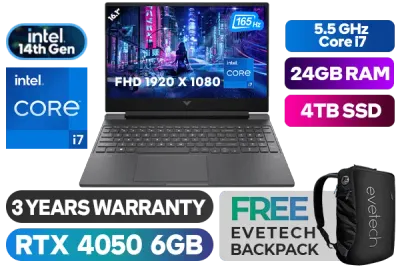 HP Victus Gaming Laptop 16-r1005ni Intel Core i7 14700HX up to 5.5GHz Processor, 33MB Cache, 20x Cores, 28x Threads / 24GB DDR5 RAM / 4TB Ultra-Fast NVME SSD / 16.1" FHD 1920x1080 165Hz Anti-glare IPS-Level Display / RTX 4050 6GB GDDR6 Dedicated Graphics / Windows 11 Home (64bit) / Realtek Wi-Fi 6 Wireless LAN / Bluetooth 5.3 / HP True Vision 1080p FHD Camera / 3x USB Type-A / 1x USB Type-C (USB Power Delivery, DisplayPort™ 1.4, HP Sleep and Charge) / 1x HDMI 2.1 / 1x Headphone and Microphone Combo Jack / 1x RJ45 Ethernet LAN / RGB Backlit Keyboard / DTS:X® Ultra, Dual speakers, HP Audio Boost, HyperX / HP Victus Intel Core i7 RTX 4050 Gaming Laptop DealHP Victus Gaming Laptop 16-r1005ni Intel Core i7 14700HX up to 5.5GHz Processor, 33MB Cache, 20x Cores, 28x Threads / 24GB DDR5 RAM / 4TB Ultra-Fast NVME SSD / 16.1" FHD 1920x1080 165Hz Anti-glare IPS-Level Display / RTX 4050 6GB GDDR6 Dedicated Graphics / Windows 11 Home (64bit) / Realtek Wi-Fi 6 Wireless LAN / Bluetooth 5.3 / HP True Vision 1080p FHD Camera / 3x USB Type-A / 1x USB Type-C (USB Power Delivery, DisplayPort™ 1.4, HP Sleep and Charge) / 1x HDMI 2.1 / 1x Headphone and Microphone Combo Jack / 1x RJ45 Ethernet LAN / RGB Backlit Keyboard / DTS:X® Ultra, Dual speakers, HP Audio Boost, HyperX / HP Victus Intel Core i7 RTX 4050 Gaming Laptop Deal [A76VCEA/24GB/4TB] / 3 YEARS WARRANTY / [+] GET FREE EVETECH NEO Premium Gaming Backpack+ FREE DELIVERY !
