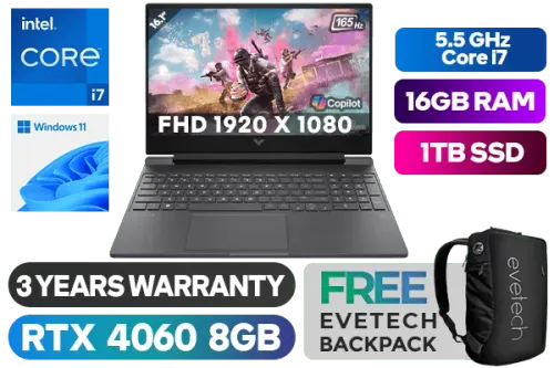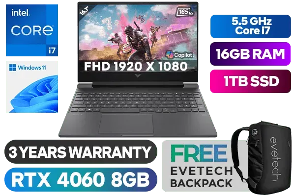 HP Victus Gaming Laptop 16-r1004ni Intel Core i7 14700HX up to 5.5GHz Processor, 33MB Cache, 20x Cores, 28x Threads / 16GB DDR5 RAM / 1TB Ultra-Fast NVME SSD / 16.1" FHD 1920x1080 165Hz Anti-glare IPS-Level Display / RTX 4060 8GB GDDR6 Dedicated Graphics / Windows 11 Home (64bit) / Realtek Wi-Fi 6 Wireless LAN / Bluetooth 5.3 / HP True Vision 1080p FHD Camera / 3x USB Type-A / 1x USB Type-C (USB Power Delivery, DisplayPort™ 1.4, HP Sleep and Charge) / 1x HDMI 2.1 / 1x Headphone and Microphone Combo Jack / 1x RJ45 Ethernet LAN / RGB Backlit Keyboard / DTS:X® Ultra, Dual speakers, HP Audio Boost, HyperX / HP Victus Intel Core i7 RTX 4060 Gaming Laptop DealHP Victus Gaming Laptop 16-r1004ni Intel Core i7 14700HX up to 5.5GHz Processor, 33MB Cache, 20x Cores, 28x Threads / 16GB DDR5 RAM / 1TB Ultra-Fast NVME SSD / 16.1" FHD 1920x1080 165Hz Anti-glare IPS-Level Display / RTX 4060 8GB GDDR6 Dedicated Graphics / Windows 11 Home (64bit) / Realtek Wi-Fi 6 Wireless LAN / Bluetooth 5.3 / HP True Vision 1080p FHD Camera / 3x USB Type-A / 1x USB Type-C (USB Power Delivery, DisplayPort™ 1.4, HP Sleep and Charge) / 1x HDMI 2.1 / 1x Headphone and Microphone Combo Jack / 1x RJ45 Ethernet LAN / RGB Backlit Keyboard / DTS:X® Ultra, Dual speakers, HP Audio Boost, HyperX / HP Victus Intel Core i7 RTX 4060 Gaming Laptop Deal [A76VBEA] / 3 YEARS WARRANTY / [+] GET FREE EVETECH NEO Premium Gaming Backpack+ FREE DELIVERY !