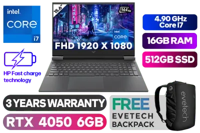Victus by HP Laptop 15-fa1010ni Intel® Core™ i7-13620H up to 4.90GHz Processor, 24MB Cache, 10x Cores, 16x Threads / 16GB DDR4 RAM / 512GB Ultra-Fast SSD / 15.6" Full HD 1920x1080 Anti-glare 144Hz Refresh Rate With IPS-Level micro-edge Display / NVIDIA GeForce RTX 4050 6GB GDDR6 Dedicated Graphics / Windows 11 Home 64bit / MediaTek Wi-Fi 6 MT7921 Wireless LAN / Bluetooth 5.3 / HP Wide Vision 720p Camera with Integrated Dual Array Digital Microphone / 2x USB Type-A / 1x USB Type-C / 1x HDMI 2.1 / 1x Headphone and Microphone Combo Jack / Integrated GbE LAN / 1x Multi-format SD Card Reader / No DVD Drive Included / White Backlit Keyboard / Bang & Olufsen, dual speakers, HP Audio Boost / Supports battery fast charge: approximately 50% in 30 minutes / HP Victus A19LKEA Intel® Core™ i7 RTX 4050 Gaming Laptop DealVictus by HP Laptop 15-fa1010ni Intel® Core™ i7-13620H up to 4.90GHz Processor, 24MB Cache, 10x Cores, 16x Threads / 16GB DDR4 RAM / 512GB Ultra-Fast SSD / 15.6" Full HD 1920x1080 Anti-glare 144Hz Refresh Rate With IPS-Level micro-edge Display / NVIDIA GeForce RTX 4050 6GB GDDR6 Dedicated Graphics / Windows 11 Home 64bit / MediaTek Wi-Fi 6 MT7921 Wireless LAN / Bluetooth 5.3 / HP Wide Vision 720p Camera with Integrated Dual Array Digital Microphone / 2x USB Type-A / 1x USB Type-C / 1x HDMI 2.1 / 1x Headphone and Microphone Combo Jack / Integrated GbE LAN / 1x Multi-format SD Card Reader / No DVD Drive Included / White Backlit Keyboard / Bang & Olufsen, dual speakers, HP Audio Boost / Supports battery fast charge: approximately 50% in 30 minutes / HP Victus A19LKEA Intel® Core™ i7 RTX 4050 Gaming Laptop Deal [A19LKEA/16GB] / 3 YEARS WARRANTY / [+] GET FREE EVETECH NEO Premium Gaming Backpack+ FREE DELIVERY !