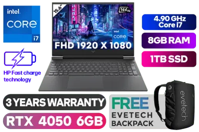 Victus by HP Laptop 15-fa1010ni Intel® Core™ i7-13620H up to 4.90GHz Processor, 24MB Cache, 10x Cores, 16x Threads / 8GB DDR4 RAM / 1TB Ultra-Fast SSD / 15.6" Full HD 1920x1080 Anti-glare 144Hz Refresh Rate With IPS-Level micro-edge Display / NVIDIA GeForce RTX 4050 6GB GDDR6 Dedicated Graphics / Windows 11 Home 64bit / MediaTek Wi-Fi 6 MT7921 Wireless LAN / Bluetooth 5.3 / HP Wide Vision 720p Camera with Integrated Dual Array Digital Microphone / 2x USB Type-A / 1x USB Type-C / 1x HDMI 2.1 / 1x Headphone and Microphone Combo Jack / Integrated GbE LAN / 1x Multi-format SD Card Reader / No DVD Drive Included / White Backlit Keyboard / Bang & Olufsen, dual speakers, HP Audio Boost / Supports battery fast charge: approximately 50% in 30 minutes / HP Victus A19LKEA Intel® Core™ i7 RTX 4050 Gaming Laptop DealVictus by HP Laptop 15-fa1010ni Intel® Core™ i7-13620H up to 4.90GHz Processor, 24MB Cache, 10x Cores, 16x Threads / 8GB DDR4 RAM / 1TB Ultra-Fast SSD / 15.6" Full HD 1920x1080 Anti-glare 144Hz Refresh Rate With IPS-Level micro-edge Display / NVIDIA GeForce RTX 4050 6GB GDDR6 Dedicated Graphics / Windows 11 Home 64bit / MediaTek Wi-Fi 6 MT7921 Wireless LAN / Bluetooth 5.3 / HP Wide Vision 720p Camera with Integrated Dual Array Digital Microphone / 2x USB Type-A / 1x USB Type-C / 1x HDMI 2.1 / 1x Headphone and Microphone Combo Jack / Integrated GbE LAN / 1x Multi-format SD Card Reader / No DVD Drive Included / White Backlit Keyboard / Bang & Olufsen, dual speakers, HP Audio Boost / Supports battery fast charge: approximately 50% in 30 minutes / HP Victus A19LKEA Intel® Core™ i7 RTX 4050 Gaming Laptop Deal [A19LKEA/1TB] / 3 YEARS WARRANTY / [+] GET FREE EVETECH NEO Premium Gaming Backpack+ FREE DELIVERY !