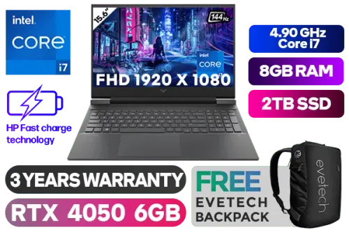 Victus by HP Laptop 15-fa1010ni Intel® Core™ i7-13620H up to 4.90GHz Processor, 24MB Cache, 10x Cores, 16x Threads / 8GB DDR4 RAM / 2TB Ultra-Fast SSD / 15.6" Full HD 1920x1080 Anti-glare 144Hz Refresh Rate With IPS-Level micro-edge Display / NVIDIA GeForce RTX 4050 6GB GDDR6 Dedicated Graphics / Windows 11 Home 64bit / MediaTek Wi-Fi 6 MT7921 Wireless LAN / Bluetooth 5.3 / HP Wide Vision 720p Camera with Integrated Dual Array Digital Microphone / 2x USB Type-A / 1x USB Type-C / 1x HDMI 2.1 / 1x Headphone and Microphone Combo Jack / Integrated GbE LAN / 1x Multi-format SD Card Reader / No DVD Drive Included / White Backlit Keyboard / Bang & Olufsen, dual speakers, HP Audio Boost / Supports battery fast charge: approximately 50% in 30 minutes / HP Victus A19LKEA Intel® Core™ i7 RTX 4050 Gaming Laptop DealVictus by HP Laptop 15-fa1010ni Intel® Core™ i7-13620H up to 4.90GHz Processor, 24MB Cache, 10x Cores, 16x Threads / 8GB DDR4 RAM / 2TB Ultra-Fast SSD / 15.6" Full HD 1920x1080 Anti-glare 144Hz Refresh Rate With IPS-Level micro-edge Display / NVIDIA GeForce RTX 4050 6GB GDDR6 Dedicated Graphics / Windows 11 Home 64bit / MediaTek Wi-Fi 6 MT7921 Wireless LAN / Bluetooth 5.3 / HP Wide Vision 720p Camera with Integrated Dual Array Digital Microphone / 2x USB Type-A / 1x USB Type-C / 1x HDMI 2.1 / 1x Headphone and Microphone Combo Jack / Integrated GbE LAN / 1x Multi-format SD Card Reader / No DVD Drive Included / White Backlit Keyboard / Bang & Olufsen, dual speakers, HP Audio Boost / Supports battery fast charge: approximately 50% in 30 minutes / HP Victus A19LKEA Intel® Core™ i7 RTX 4050 Gaming Laptop Deal [A19LKEA/2TB] / 3 YEARS WARRANTY / [+] GET FREE EVETECH NEO Premium Gaming Backpack+ FREE DELIVERY !