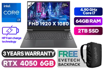 Victus by HP Laptop 15-fa1010ni Intel® Core™ i7-13620H up to 4.90GHz Processor, 24MB Cache, 10x Cores, 16x Threads / 64GB DDR4 RAM / 2TB Ultra-Fast SSD / 15.6" Full HD 1920x1080 Anti-glare 144Hz Refresh Rate With IPS-Level micro-edge Display / NVIDIA GeForce RTX 4050 6GB GDDR6 Dedicated Graphics / Windows 11 Home 64bit / MediaTek Wi-Fi 6 MT7921 Wireless LAN / Bluetooth 5.3 / HP Wide Vision 720p Camera with Integrated Dual Array Digital Microphone / 2x USB Type-A / 1x USB Type-C / 1x HDMI 2.1 / 1x Headphone and Microphone Combo Jack / Integrated GbE LAN / 1x Multi-format SD Card Reader / No DVD Drive Included / White Backlit Keyboard / Bang & Olufsen, dual speakers, HP Audio Boost / Supports battery fast charge: approximately 50% in 30 minutes / HP Victus A19LKEA Intel® Core™ i7 RTX 4050 Gaming Laptop DealVictus by HP Laptop 15-fa1010ni Intel® Core™ i7-13620H up to 4.90GHz Processor, 24MB Cache, 10x Cores, 16x Threads / 64GB DDR4 RAM / 2TB Ultra-Fast SSD / 15.6" Full HD 1920x1080 Anti-glare 144Hz Refresh Rate With IPS-Level micro-edge Display / NVIDIA GeForce RTX 4050 6GB GDDR6 Dedicated Graphics / Windows 11 Home 64bit / MediaTek Wi-Fi 6 MT7921 Wireless LAN / Bluetooth 5.3 / HP Wide Vision 720p Camera with Integrated Dual Array Digital Microphone / 2x USB Type-A / 1x USB Type-C / 1x HDMI 2.1 / 1x Headphone and Microphone Combo Jack / Integrated GbE LAN / 1x Multi-format SD Card Reader / No DVD Drive Included / White Backlit Keyboard / Bang & Olufsen, dual speakers, HP Audio Boost / Supports battery fast charge: approximately 50% in 30 minutes / HP Victus A19LKEA Intel® Core™ i7 RTX 4050 Gaming Laptop Deal [A19LKEA/64GB/2TB] / 3 YEARS WARRANTY / [+] GET FREE EVETECH NEO Premium Gaming Backpack+ FREE DELIVERY !