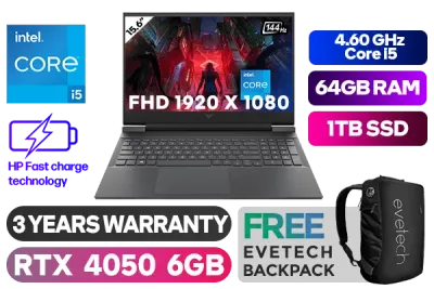 Victus by HP Laptop 15-fa1011ni Intel® Core⢠i5-13420H up to 4.60GHz Processor, 12MB Cache, 8x Cores, 12x Threads / 64GB DDR4 RAM / 1TB Ultra-Fast SSD / 15.6" Full HD 1920x1080 Anti-glare 144Hz Refresh Rate With IPS-Level micro-edge Display / NVIDIA GeForce RTX 4050 6GB GDDR6 Dedicated Graphics / Windows 11 Home 64bit / MediaTek Wi-Fi 6 MT7921 Wireless LAN / Bluetooth 5.3 / HP Wide Vision 720p Camera with Integrated Dual Array Digital Microphone / 2x USB Type-A / 1x USB Type-C / 1x HDMI 2.1 / 1x Headphone and Microphone Combo Jack / Integrated GbE LAN / 1x Multi-format SD Card Reader / No DVD Drive Included / White Backlit Keyboard / Bang & Olufsen, dual speakers, HP Audio Boost / Supports battery fast charge: approximately 50% in 30 minutes / HP Victus A19LLEA Intel® Core⢠i5 RTX 4050 Gaming Laptop DealVictus by HP Laptop 15-fa1011ni Intel® Core⢠i5-13420H up to 4.60GHz Processor, 12MB Cache, 8x Cores, 12x Threads / 64GB DDR4 RAM / 1TB Ultra-Fast SSD / 15.6" Full HD 1920x1080 Anti-glare 144Hz Refresh Rate With IPS-Level micro-edge Display / NVIDIA GeForce RTX 4050 6GB GDDR6 Dedicated Graphics / Windows 11 Home 64bit / MediaTek Wi-Fi 6 MT7921 Wireless LAN / Bluetooth 5.3 / HP Wide Vision 720p Camera with Integrated Dual Array Digital Microphone / 2x USB Type-A / 1x USB Type-C / 1x HDMI 2.1 / 1x Headphone and Microphone Combo Jack / Integrated GbE LAN / 1x Multi-format SD Card Reader / No DVD Drive Included / White Backlit Keyboard / Bang & Olufsen, dual speakers, HP Audio Boost / Supports battery fast charge: approximately 50% in 30 minutes / HP Victus A19LLEA Intel® Core⢠i5 RTX 4050 Gaming Laptop Deal [A19LLEA/64GB/1TB] / 3 YEARS WARRANTY / [+] GET FREE EVETECH NEO Premium Gaming Backpack+ FREE DELIVERY !