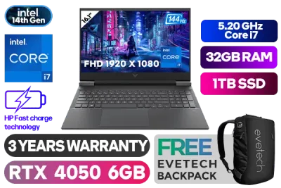 Victus by HP Laptop 16-r1001ni Intel® Core™ i7-14650HX up to 5.20GHz Processor, 30MB Cache, 16x Cores, 24x Threads / 32GB DDR5 RAM / 1TB Ultra-Fast NVMe SSD / 16.1" FHD 1920x1080 Anti-glare 144Hz Refresh Rate With IPS-Level micro-edge Display / NVIDIA GeForce RTX 4050 6GB GDDR6 Dedicated Graphics / Windows 11 Home 64bit / Realtek RTL8852BE WiFi 6 Wireless LAN / Bluetooth 5.3 / HP True Vision 1080p FHD camera with temporal noise reduction and Integrated Dual Array Digital Microphone / 3x USB Type-A / 1x USB Type-C / 1x HDMI 2.1 / 1x Headphone and Microphone Combo Jack / Integrated GbE LAN / No DVD Drive Included / White Backlit Keyboard / DTS:X® Ultra; Dual speakers; HP Audio Boost; HyperX / Supports battery fast charge: approximately 50% in 30 minutes / HP Victus A19LWEA Intel® Core™ i7 RTX 4050 Gaming Laptop DealVictus by HP Laptop 16-r1001ni Intel® Core™ i7-14650HX up to 5.20GHz Processor, 30MB Cache, 16x Cores, 24x Threads / 32GB DDR5 RAM / 1TB Ultra-Fast NVMe SSD / 16.1" FHD 1920x1080 Anti-glare 144Hz Refresh Rate With IPS-Level micro-edge Display / NVIDIA GeForce RTX 4050 6GB GDDR6 Dedicated Graphics / Windows 11 Home 64bit / Realtek RTL8852BE WiFi 6 Wireless LAN / Bluetooth 5.3 / HP True Vision 1080p FHD camera with temporal noise reduction and Integrated Dual Array Digital Microphone / 3x USB Type-A / 1x USB Type-C / 1x HDMI 2.1 / 1x Headphone and Microphone Combo Jack / Integrated GbE LAN / No DVD Drive Included / White Backlit Keyboard / DTS:X® Ultra; Dual speakers; HP Audio Boost; HyperX / Supports battery fast charge: approximately 50% in 30 minutes / HP Victus A19LWEA Intel® Core™ i7 RTX 4050 Gaming Laptop Deal [A19LWEA/32GB/1TB] / 3 YEARS WARRANTY / [+] GET FREE EVETECH NEO Premium Gaming Backpack+ FREE DELIVERY !