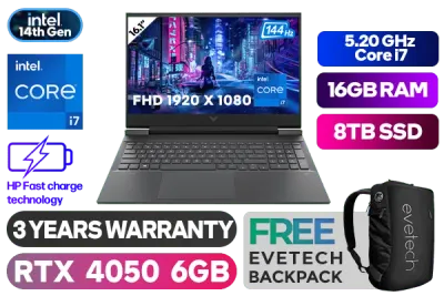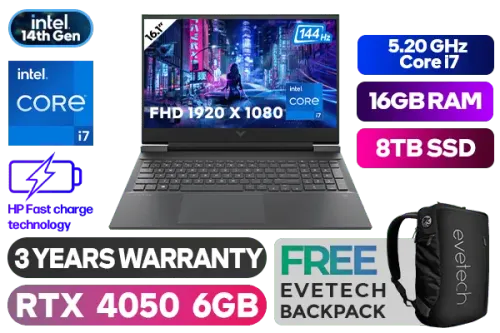 Victus by HP Laptop 16-r1001ni Intel® Core™ i7-14650HX up to 5.20GHz Processor, 30MB Cache, 16x Cores, 24x Threads / 16GB DDR5 RAM / 8TB Ultra-Fast NVMe SSD / 16.1" FHD 1920x1080 Anti-glare 144Hz Refresh Rate With IPS-Level micro-edge Display / NVIDIA GeForce RTX 4050 6GB GDDR6 Dedicated Graphics / Windows 11 Home 64bit / Realtek RTL8852BE WiFi 6 Wireless LAN / Bluetooth 5.3 / HP True Vision 1080p FHD camera with temporal noise reduction and Integrated Dual Array Digital Microphone / 3x USB Type-A / 1x USB Type-C / 1x HDMI 2.1 / 1x Headphone and Microphone Combo Jack / Integrated GbE LAN / No DVD Drive Included / White Backlit Keyboard / DTS:X® Ultra; Dual speakers; HP Audio Boost; HyperX / Supports battery fast charge: approximately 50% in 30 minutes / HP Victus A19LWEA Intel® Core™ i7 RTX 4050 Gaming Laptop DealVictus by HP Laptop 16-r1001ni Intel® Core™ i7-14650HX up to 5.20GHz Processor, 30MB Cache, 16x Cores, 24x Threads / 16GB DDR5 RAM / 8TB Ultra-Fast NVMe SSD / 16.1" FHD 1920x1080 Anti-glare 144Hz Refresh Rate With IPS-Level micro-edge Display / NVIDIA GeForce RTX 4050 6GB GDDR6 Dedicated Graphics / Windows 11 Home 64bit / Realtek RTL8852BE WiFi 6 Wireless LAN / Bluetooth 5.3 / HP True Vision 1080p FHD camera with temporal noise reduction and Integrated Dual Array Digital Microphone / 3x USB Type-A / 1x USB Type-C / 1x HDMI 2.1 / 1x Headphone and Microphone Combo Jack / Integrated GbE LAN / No DVD Drive Included / White Backlit Keyboard / DTS:X® Ultra; Dual speakers; HP Audio Boost; HyperX / Supports battery fast charge: approximately 50% in 30 minutes / HP Victus A19LWEA Intel® Core™ i7 RTX 4050 Gaming Laptop Deal [A19LWEA/8TB] / 3 YEARS WARRANTY / [+] GET FREE EVETECH NEO Premium Gaming Backpack+ FREE DELIVERY !