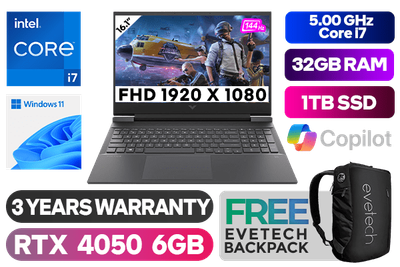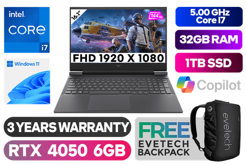 Victus by HP Laptop 16-r0001ni 13th Gen Intel Core i7-13700H up to 5.00GHz Processor, 24MB Cache, 14x Cores, 20x Threads / 32GB DDR5 RAM / 1TB Ultra-Fast NVME SSD / 16.1" Full HD 1920x1080 144Hz Anti-glare IPS-Level micro-edge Display / NVIDIA 40 Series GeForce RTX 4050 6GB GDDR6 Dedicated Graphics / Windows 11 Home 64bit / Dual Band Wi-Fi 6 Wireless LAN / Bluetooth 5.2 / HP Wide Vision FHD camera with temporal noise reduction and integrated dual array digital microphones / 3x SuperSpeed USB Type-A / 1x SuperSpeed USB Type-C / 1x HDMI 2.1 / 1x Headphone and Microphone Combo Jack / Integrated GbE LAN / No DVD Drive Included / White Backlit Keyboard / Bang & Olufsen, dual speakers, HP Audio Boost / HP Victus Intel Core i7 RTX 4050 Gaming Laptop 7Z8T8EA DealVictus by HP Laptop 16-r0001ni 13th Gen Intel Core i7-13700H up to 5.00GHz Processor, 24MB Cache, 14x Cores, 20x Threads / 32GB DDR5 RAM / 1TB Ultra-Fast NVME SSD / 16.1" Full HD 1920x1080 144Hz Anti-glare IPS-Level micro-edge Display / NVIDIA 40 Series GeForce RTX 4050 6GB GDDR6 Dedicated Graphics / Windows 11 Home 64bit / Dual Band Wi-Fi 6 Wireless LAN / Bluetooth 5.2 / HP Wide Vision FHD camera with temporal noise reduction and integrated dual array digital microphones / 3x SuperSpeed USB Type-A / 1x SuperSpeed USB Type-C / 1x HDMI 2.1 / 1x Headphone and Microphone Combo Jack / Integrated GbE LAN / No DVD Drive Included / White Backlit Keyboard / Bang & Olufsen, dual speakers, HP Audio Boost / HP Victus Intel Core i7 RTX 4050 Gaming Laptop 7Z8T8EA Deal [7Z8T8EA/32GB/1TB] / 3 YEARS WARRANTY / [+] GET FREE EVETECH NEO Premium Gaming Backpack+ FREE DELIVERY !