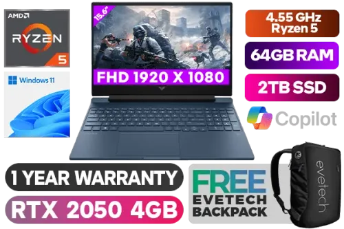 Victus by HP 15-fb1000ni Laptop AMD Ryzen 5 7535HS up to 4.55GHz Processor, 19MB Cache, 6x Cores, 12x Threads / 64GB DDR5 RAM / 2TB Ultra-Fast NVME SSD / 15.6" FHD 1920x1080 Anti-glare IPS-Level Display / NVIDIA GeForce RTX 2050 4GB GDDR6 Dedicated Graphics / Windows 11 Home 64bit / MediaTek Wi-Fi 6E Wireless LAN / Bluetooth 5.3 / HD 720p Camera / 2x USB Type-A / 1x USB Type-C / 1x HDMI 2.1 / 1x Headphone and Microphone Combo Jack / 1x RJ45 Ethernet LAN / 1x SD Card Reader / White Backlit Keyboard / Bang & Olufsen, dual speakers, HP Audio Boost / 1 Year Warranty / HP Victus 15-fb1000ni Ryzen 5 RTX 2050 Gaming Laptop DealVictus by HP 15-fb1000ni Laptop AMD Ryzen 5 7535HS up to 4.55GHz Processor, 19MB Cache, 6x Cores, 12x Threads / 64GB DDR5 RAM / 2TB Ultra-Fast NVME SSD / 15.6" FHD 1920x1080 Anti-glare IPS-Level Display / NVIDIA GeForce RTX 2050 4GB GDDR6 Dedicated Graphics / Windows 11 Home 64bit / MediaTek Wi-Fi 6E Wireless LAN / Bluetooth 5.3 / HD 720p Camera / 2x USB Type-A / 1x USB Type-C / 1x HDMI 2.1 / 1x Headphone and Microphone Combo Jack / 1x RJ45 Ethernet LAN / 1x SD Card Reader / White Backlit Keyboard / Bang & Olufsen, dual speakers, HP Audio Boost / 1 Year Warranty / HP Victus 15-fb1000ni Ryzen 5 RTX 2050 Gaming Laptop Deal [8L2K3EA-1YR/64GB/2TB] / [+] GET FREE EVETECH NEO Premium Gaming Backpack+ FREE DELIVERY !
