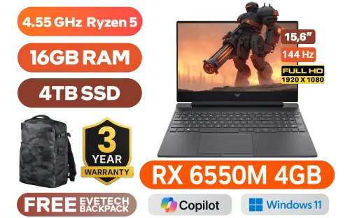 Victus by HP Laptop 15-fb2004ni AMD Ryzen 5 7535HS up to 4.55GHz Processor, 19MB Cache, 6x Cores, 12x Threads / 16GB DDR5 RAM / 4TB Ultra-Fast NVME SSD / 15.6" Full HD 1920x1080 144Hz Anti-glare IPS-Level micro-edge Display / AMD Radeon™ RX 6550M 4GB GDDR6 Dedicated Graphics / Windows 11 Home 64bit / Realtek RTL8852BE Wifi 6 Wireless LAN / Bluetooth 5.3 / HP Wide Vision 720p HD camera with temporal noise reduction and integrated dual array digital microphones / 2x USB Type-A / 1x USB Type-C / 1x HDMI 2.1 / 1x Headphone and Microphone Combo Jack / Integrated GbE LAN / 1x Multi-format SD Card Reader / No DVD Drive Included / White Backlit Keyboard / DTS:X® Ultra, dual speakers, HP Audio Boost / HP Victus Ryzen 5 RX 6550M Gaming Laptop A73T9EA DealVictus by HP Laptop 15-fb2004ni AMD Ryzen 5 7535HS up to 4.55GHz Processor, 19MB Cache, 6x Cores, 12x Threads / 16GB DDR5 RAM / 4TB Ultra-Fast NVME SSD / 15.6" Full HD 1920x1080 144Hz Anti-glare IPS-Level micro-edge Display / AMD Radeon™ RX 6550M 4GB GDDR6 Dedicated Graphics / Windows 11 Home 64bit / Realtek RTL8852BE Wifi 6 Wireless LAN / Bluetooth 5.3 / HP Wide Vision 720p HD camera with temporal noise reduction and integrated dual array digital microphones / 2x USB Type-A / 1x USB Type-C / 1x HDMI 2.1 / 1x Headphone and Microphone Combo Jack / Integrated GbE LAN / 1x Multi-format SD Card Reader / No DVD Drive Included / White Backlit Keyboard / DTS:X® Ultra, dual speakers, HP Audio Boost / HP Victus Ryzen 5 RX 6550M Gaming Laptop A73T9EA Deal [A73T9EA/16GB/4TB] / 3 YEARS WARRANTY / [+] GET FREE EVETECH DASH Premium Gaming Backpack+ FREE DELIVERY !