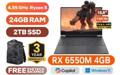 Victus by HP Laptop 15-fb2004ni AMD Ryzen 5 7535HS up to 4.55GHz Processor, 19MB Cache, 6x Cores, 12x Threads / 24GB DDR5 RAM / 2TB Ultra-Fast NVME SSD / 15.6" Full HD 1920x1080 144Hz Anti-glare IPS-Level micro-edge Display / AMD Radeon™ RX 6550M 4GB GDDR6 Dedicated Graphics / Windows 11 Home 64bit / Realtek RTL8852BE Wifi 6 Wireless LAN / Bluetooth 5.3 / HP Wide Vision 720p HD camera with temporal noise reduction and integrated dual array digital microphones / 2x USB Type-A / 1x USB Type-C / 1x HDMI 2.1 / 1x Headphone and Microphone Combo Jack / Integrated GbE LAN / 1x Multi-format SD Card Reader / No DVD Drive Included / White Backlit Keyboard / DTS:X® Ultra, dual speakers, HP Audio Boost / HP Victus Ryzen 5 RX 6550M Gaming Laptop A73T9EA DealVictus by HP Laptop 15-fb2004ni AMD Ryzen 5 7535HS up to 4.55GHz Processor, 19MB Cache, 6x Cores, 12x Threads / 24GB DDR5 RAM / 2TB Ultra-Fast NVME SSD / 15.6" Full HD 1920x1080 144Hz Anti-glare IPS-Level micro-edge Display / AMD Radeon™ RX 6550M 4GB GDDR6 Dedicated Graphics / Windows 11 Home 64bit / Realtek RTL8852BE Wifi 6 Wireless LAN / Bluetooth 5.3 / HP Wide Vision 720p HD camera with temporal noise reduction and integrated dual array digital microphones / 2x USB Type-A / 1x USB Type-C / 1x HDMI 2.1 / 1x Headphone and Microphone Combo Jack / Integrated GbE LAN / 1x Multi-format SD Card Reader / No DVD Drive Included / White Backlit Keyboard / DTS:X® Ultra, dual speakers, HP Audio Boost / HP Victus Ryzen 5 RX 6550M Gaming Laptop A73T9EA Deal [A73T9EA/24GB/2TB] / 3 YEARS WARRANTY / [+] GET FREE EVETECH DASH Premium Gaming Backpack+ FREE DELIVERY !