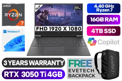 Victus by HP Laptop 15-fb0022ni AMD Ryzen 7 5800H up to 4.40GHz Processor, 20MB Cache, 8x Cores, 16x Threads / 16GB DDR4 RAM / 4TB Ultra-Fast NVME SSD / 15.6" Full HD 1920x1080 Anti-glare 144Hz Refresh Rate With IPS-Level micro-edge Display / NVIDIA GeForce RTX 3050 Ti 4GB GDDR6 Dedicated Graphics / Windows 11 Home 64bit / Dual Band Wi-Fi 6 Wireless LAN / Bluetooth 5.3 / HP Wide Vision 720p Camera with Integrated Dual Array Digital Microphone / 2x SuperSpeed USB Type-A / 1x SuperSpeed USB Type-C / 1x HDMI 2.1 / 1x Headphone and Microphone Combo Jack / Integrated GbE LAN / 1x Multi-format SD Card Reader / No DVD Drive Included / White Backlit Keyboard / Bang & Olufsen, dual speakers, HP Audio Boost / Supports battery fast charge: approximately 50% in 30 minutes / HP Victus Ryzen 7 RTX 3050 Ti Gaming Laptop 872X9EA DealVictus by HP Laptop 15-fb0022ni AMD Ryzen 7 5800H up to 4.40GHz Processor, 20MB Cache, 8x Cores, 16x Threads / 16GB DDR4 RAM / 4TB Ultra-Fast NVME SSD / 15.6" Full HD 1920x1080 Anti-glare 144Hz Refresh Rate With IPS-Level micro-edge Display / NVIDIA GeForce RTX 3050 Ti 4GB GDDR6 Dedicated Graphics / Windows 11 Home 64bit / Dual Band Wi-Fi 6 Wireless LAN / Bluetooth 5.3 / HP Wide Vision 720p Camera with Integrated Dual Array Digital Microphone / 2x SuperSpeed USB Type-A / 1x SuperSpeed USB Type-C / 1x HDMI 2.1 / 1x Headphone and Microphone Combo Jack / Integrated GbE LAN / 1x Multi-format SD Card Reader / No DVD Drive Included / White Backlit Keyboard / Bang & Olufsen, dual speakers, HP Audio Boost / Supports battery fast charge: approximately 50% in 30 minutes / HP Victus Ryzen 7 RTX 3050 Ti Gaming Laptop 872X9EA Deal [872X9EA/4TB] / 3 YEARS WARRANTY / [+] GET FREE EVETECH NEO Premium Gaming Backpack+ FREE DELIVERY !