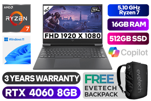 Victus by HP Laptop 16-s0000ni AMD Ryzen 7 7840HS up to 5.10GHz Processor, 24MB Cache, 8x Cores, 16x Threads / 16GB DDR5 RAM / 512GB Ultra-Fast NVME SSD / 16.1" Full HD 1920x1080 144Hz Anti-glare IPS-Level micro-edge Display / NVIDIA 40 Series GeForce RTX 4060 8GB GDDR6 Dedicated Graphics / Windows 11 Home 64bit / Dual Band Wi-Fi 6 Wireless LAN / Bluetooth 5.2 / HP Wide Vision FHD camera with temporal noise reduction and integrated dual array digital microphones / 3x SuperSpeed USB Type-A / 1x SuperSpeed USB Type-C / 1x HDMI 2.1 / 1x Headphone and Microphone Combo Jack / Integrated GbE LAN / No DVD Drive Included / White Backlit Keyboard / Bang & Olufsen, dual speakers, HP Audio Boost / HP Victus Ryzen 7 RTX 4060 Gaming Laptop DealVictus by HP Laptop 16-s0000ni AMD Ryzen 7 7840HS up to 5.10GHz Processor, 24MB Cache, 8x Cores, 16x Threads / 16GB DDR5 RAM / 512GB Ultra-Fast NVME SSD / 16.1" Full HD 1920x1080 144Hz Anti-glare IPS-Level micro-edge Display / NVIDIA 40 Series GeForce RTX 4060 8GB GDDR6 Dedicated Graphics / Windows 11 Home 64bit / Dual Band Wi-Fi 6 Wireless LAN / Bluetooth 5.2 / HP Wide Vision FHD camera with temporal noise reduction and integrated dual array digital microphones / 3x SuperSpeed USB Type-A / 1x SuperSpeed USB Type-C / 1x HDMI 2.1 / 1x Headphone and Microphone Combo Jack / Integrated GbE LAN / No DVD Drive Included / White Backlit Keyboard / Bang & Olufsen, dual speakers, HP Audio Boost / HP Victus Ryzen 7 RTX 4060 Gaming Laptop Deal [7Z8T9EA] / 3 YEARS WARRANTY / [+] GET FREE EVETECH NEO Premium Gaming Backpack+ FREE DELIVERY !
