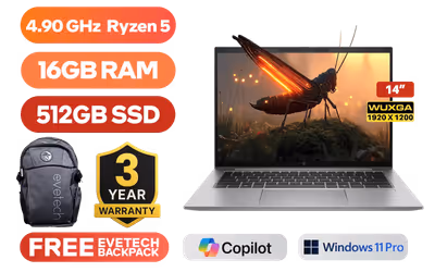 HP ZBook Firefly G11 B2ZX0ES AMD Ryzen 5 8640HS up to 4.90GHz Processor, 22MB Cache, 6x Cores, 12x Threads / 16GB DDR5 RAM / 512GB Ultra-Fast NVMe SSD / 14" WUXGA (1920 x 1200) IPS-Level Anti-Glare Display / Integrated AMD Radeon Graphics / <span style="font-size: 20px; color: #00BFFF; font-weight: bold;">Windows 11 Pro (64-bit)</span> / MediaTek MT7922 Wi-Fi 6E Wireless LAN / Bluetooth 5.3 / 5MP Camera / 2x USB Type-A / 2x USB Type-C (Thunderbolt 4) / 1x HDMI / 1x Headphone & Microphone Combo Jack / 1x SIM Card Tray / Fingerprint Reader / Non-Backlit Keyboard / HP ZBook Firefly G11 B2ZX0ES AMD Ryzen 5 Laptop DealHP ZBook Firefly G11 B2ZX0ES AMD Ryzen 5 8640HS up to 4.90GHz Processor, 22MB Cache, 6x Cores, 12x Threads / 16GB DDR5 RAM / 512GB Ultra-Fast NVMe SSD / 14" WUXGA (1920 x 1200) IPS-Level Anti-Glare Display / Integrated AMD Radeon Graphics / Windows 11 Pro (64-bit) / MediaTek MT7922 Wi-Fi 6E Wireless LAN / Bluetooth 5.3 / 5MP Camera / 2x USB Type-A / 2x USB Type-C (Thunderbolt 4) / 1x HDMI / 1x Headphone & Microphone Combo Jack / 1x SIM Card Tray / Fingerprint Reader / Non-Backlit Keyboard / HP ZBook Firefly G11 B2ZX0ES AMD Ryzen 5 Laptop Deal [B2ZX0ES] / 3 YEARS WARRANTY / [+] GET FREE EVETECH FLUX Premium Gaming Backpack+ FREE DELIVERY !