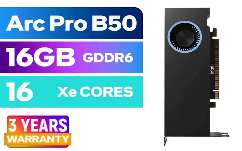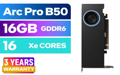 Intel Arc Pro B50 16GB Workstation Graphics Card / 16GB GDDR6 / 128 XMX Engines / 128 Vector Engines / 16 Xe2 Cores / 128-bit / Max Dynamic Clock: 2600MHz / PCIe 5.0 x8 Interface / 33P6PEB0BB