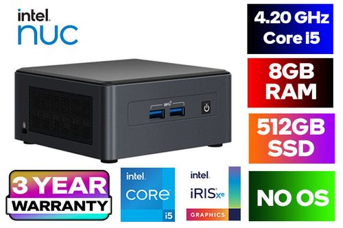 Intel NUC BNUC11TNHI50000 11th Gen Core i5 Mini PC Kit / 11th Generation Core i5-1135G7 Turbo up to 4.20GHz Processor / Intel Iris Xe Graphics / Wi-Fi 6 AX201 Wireless LAN / Bluetooth / Intel Gigabit LAN / Front: 2x USB / Rear: 2x USB Thunderbolt Type-C, 1x USB 3.0, 1x USB 2.0, 2x HDMI, 1x RJ45 / No OS Included / 8GB RAM / 512GB Ultra-fast SSD / BNUC11TNHI50000/8GB/512GB / BNUC11TNHI50000