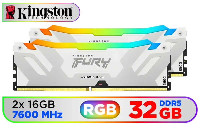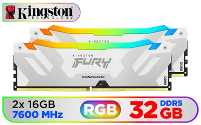 Kingston Fury Renegade RGB 32GB (2x16GB) 7600Mhz DDR5 Desktop Memory - White / Kit of 2 / 18 Customisable RGB Effects / Infrared Sync Technology / KF576C38RWAK2-32