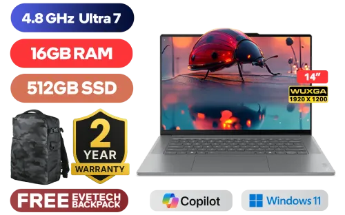 Lenovo Yoga Slim 7 14IMH9 Intel® Core™ Ultra 7-155H Up to 4.8GHz Processor, 24MB Cache, 16x Cores, 22x Threads / 16GB LPDDR5X RAM / 512GB Ultra-Fast NVME SSD / 14" WUXGA (1920 x 1200) OLED Display / Integrated Intel Arc Graphics / Windows 11 Home (64bit) / 1080P FHD Camera with E-Shutter / Intel Wi-Fi 6 AX203 Wireless LAN / Bluetooth 5.3 / Dolby Atmos® Audio / 1x USB Type-A / 2x USB Type-C (Thunderbolt™ 4 with USB PD 3.1 and DisplayPort™ 1.4) / 1x HDMI 2.1 / 1x Headphone Audio & Microphone Combo Jack / White Backlit keyboard / 2 Years Warranty / Lenovo Yoga Slim 7 Intel® Core™ Ultra 7 Laptop DealLenovo Yoga Slim 7 14IMH9 Intel® Core™ Ultra 7-155H Up to 4.8GHz Processor, 24MB Cache, 16x Cores, 22x Threads / 16GB LPDDR5X RAM / 512GB Ultra-Fast NVME SSD / 14" WUXGA (1920 x 1200) OLED Display / Integrated Intel Arc Graphics / Windows 11 Home (64bit) / 1080P FHD Camera with E-Shutter / Intel Wi-Fi 6 AX203 Wireless LAN / Bluetooth 5.3 / Dolby Atmos® Audio / 1x USB Type-A / 2x USB Type-C (Thunderbolt™ 4 with USB PD 3.1 and DisplayPort™ 1.4) / 1x HDMI 2.1 / 1x Headphone Audio & Microphone Combo Jack / White Backlit keyboard / 2 Years Warranty / Lenovo Yoga Slim 7 Intel® Core™ Ultra 7 Laptop Deal [83CV007RSA] / [+] GET FREE EVETECH DASH Premium Gaming Backpack+ FREE DELIVERY !