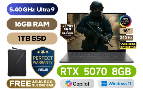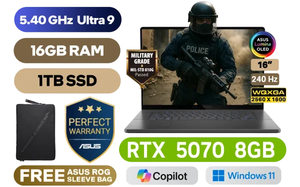 ASUS ROG Zephyrus G16 GU605CP Intel® Core™ Ultra 9-285H up to 5.40GHz Processor, 24MB Cache, 16x Cores, 16x Threads / 16GB LPDDR5X RAM / 1TB Ultra-Fast NVMe SSD / 16" 2.5K (2560 x 1600) 240Hz OLED Display / NVIDIA 50 Series GeForce RTX 5070 8GB GDDR7 Dedicated Graphics Card / Windows 11 Home (64bit) / 1080P FHD IR Camera / Wi-Fi 7 BE201 Wireless LAN / Bluetooth 5.4 / 2x USB Type-A / 2x USB Type-C / 1x HDMI 2.1 / 1x Audio And Microphone Combo Jack / 1x SD Card Reader / White Backlit chicklet keyboard / Dolby Atmos Audio with AI noise-canceling technology / ASUS ROG Zephyrus G16 Ultra 9 RTX 5070 Gaming LaptopASUS ROG Zephyrus G16 GU605CP Intel® Core™ Ultra 9-285H up to 5.40GHz Processor, 24MB Cache, 16x Cores, 16x Threads / 16GB LPDDR5X RAM / 1TB Ultra-Fast NVMe SSD / 16" 2.5K (2560 x 1600) 240Hz OLED Display / NVIDIA 50 Series GeForce RTX 5070 8GB GDDR7 Dedicated Graphics Card / Windows 11 Home (64bit) / 1080P FHD IR Camera / Wi-Fi 7 BE201 Wireless LAN / Bluetooth 5.4 / 2x USB Type-A / 2x USB Type-C / 1x HDMI 2.1 / 1x Audio And Microphone Combo Jack / 1x SD Card Reader / White Backlit chicklet keyboard / Dolby Atmos Audio with AI noise-canceling technology / ASUS ROG Zephyrus G16 Ultra 9 RTX 5070 Gaming Laptop [GU605CP-OU91610G0W] / 3 YEARS WARRANTY / [+]Get Resident Evil: Requiem with select GeForce RTX 50 Series (Standard Edition)+ FREE DELIVERY !