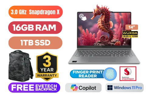 [TOUCHSCREEN] Lenovo IdeaPad 5 14Q8X9 Snapdragon X X1-26-100 up to 3.0GHz Processor, 30MB Cache, 8x Cores / 16GB LPDDR5x RAM / 1TB Ultra-Fast NVME SSD / 14" WUXGA 1920x1200 OLED-Level 60Hz Touchscreen Display / Integrated Qualcomm® Adreno™ x1-45 Graphics / <span style="font-size: 20px; color: #00BFFF; font-weight: bold;">Windows 11 Professional (64bit)</span> / Qualcomm® FastConnect™ 7800 Wireless LAN / Bluetooth 5.4 / FHD 1080p with Privacy Shutter Camera / Fingerprint Reader / 2x USB Type-A / 2x USB Type-C with (USB PD 3.0 and DisplayPort™ 1.4) / 1x HDMI / 1x microSD Card Reader / 1x Headphone and Microphone Audio Combo Jack / FREE Lenovo Digital Pen 2 / Lenovo IdeaPad 5 14Q8X9 Snapdragon X Touchscreen Laptop Deal[TOUCHSCREEN] Lenovo IdeaPad 5 14Q8X9 Snapdragon X X1-26-100 up to 3.0GHz Processor, 30MB Cache, 8x Cores / 16GB LPDDR5x RAM / 1TB Ultra-Fast NVME SSD / 14" WUXGA 1920x1200 OLED-Level 60Hz Touchscreen Display / Integrated Qualcomm® Adreno™ x1-45 Graphics / Windows 11 Professional (64bit) / Qualcomm® FastConnect™ 7800 Wireless LAN / Bluetooth 5.4 / FHD 1080p with Privacy Shutter Camera / Fingerprint Reader / 2x USB Type-A / 2x USB Type-C with (USB PD 3.0 and DisplayPort™ 1.4) / 1x HDMI / 1x microSD Card Reader / 1x Headphone and Microphone Audio Combo Jack / FREE Lenovo Digital Pen 2 / Lenovo IdeaPad 5 14Q8X9 Snapdragon X Touchscreen Laptop Deal [83GH003CSA] / 3 YEARS WARRANTY / [+] GET FREE EVETECH DASH Premium Gaming Backpack+ FREE DELIVERY !
