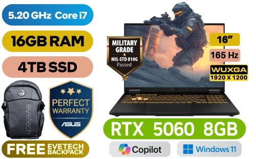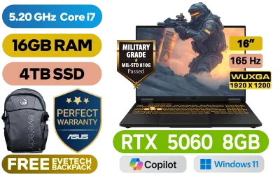 ASUS TUF Gaming F16 FX608JMR 14th Gen Intel® Core™ i7-14650HX up to 5.20GHz Processor, 30MB Cache, 16x Cores, 24x Threads / 16GB DDR5 RAM / 4TB Ultra-Fast NVMe SSD / 16" WUXGA(1920 x 1200) 165Hz, IPS-level Display / NVIDIA GeForce RTX 5060 8GB GDDR7 Dedicated Graphics / Windows 11 Home (64bit) / 1080P FHD IR Web Camera / Wi-Fi® 6E 8852CE Wireless LAN / Bluetooth 5.3 / 1x Headphone & Microphone Combo Jack / 3x USB Type-A / 2x USB Type-C (DisplayPort™ / G-SYNC) / 1x HDMI / 1x RJ45 / RGB Backlit Chicklet Keyboard / Dolby Atmos Audio system with AI noise-cancelling / ASUS TUF Gaming F16 FX608JMR Core i7 RTX 5060 Gaming LaptopASUS TUF Gaming F16 FX608JMR 14th Gen Intel® Core™ i7-14650HX up to 5.20GHz Processor, 30MB Cache, 16x Cores, 24x Threads / 16GB DDR5 RAM / 4TB Ultra-Fast NVMe SSD / 16" WUXGA(1920 x 1200) 165Hz, IPS-level Display / NVIDIA GeForce RTX 5060 8GB GDDR7 Dedicated Graphics / Windows 11 Home (64bit) / 1080P FHD IR Web Camera / Wi-Fi® 6E 8852CE Wireless LAN / Bluetooth 5.3 / 1x Headphone & Microphone Combo Jack / 3x USB Type-A / 2x USB Type-C (DisplayPort™ / G-SYNC) / 1x HDMI / 1x RJ45 / RGB Backlit Chicklet Keyboard / Dolby Atmos Audio system with AI noise-cancelling / ASUS TUF Gaming F16 FX608JMR Core i7 RTX 5060 Gaming Laptop [FX608JMR-I71610G0W/4TB] / 3 YEARS WARRANTY / [+] GET FREE EVETECH FLUX Premium Gaming Backpack+ FREE DELIVERY !