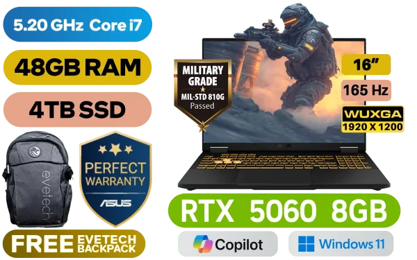 ASUS TUF Gaming F16 FX608JMR 14th Gen Intel® Core™ i7-14650HX up to 5.20GHz Processor, 30MB Cache, 16x Cores, 24x Threads / 48GB DDR5 RAM / 4TB Ultra-Fast NVMe SSD / 16" WUXGA(1920 x 1200) 165Hz, IPS-level Display / NVIDIA GeForce RTX 5060 8GB GDDR7 Dedicated Graphics / Windows 11 Home (64bit) / 1080P FHD IR Web Camera / Wi-Fi® 6E 8852CE Wireless LAN / Bluetooth 5.3 / 1x Headphone & Microphone Combo Jack / 3x USB Type-A / 2x USB Type-C (DisplayPort™ / G-SYNC) / 1x HDMI / 1x RJ45 / RGB Backlit Chicklet Keyboard / Dolby Atmos Audio system with AI noise-cancelling / ASUS TUF Gaming F16 FX608JMR Core i7 RTX 5060 Gaming LaptopASUS TUF Gaming F16 FX608JMR 14th Gen Intel® Core™ i7-14650HX up to 5.20GHz Processor, 30MB Cache, 16x Cores, 24x Threads / 48GB DDR5 RAM / 4TB Ultra-Fast NVMe SSD / 16" WUXGA(1920 x 1200) 165Hz, IPS-level Display / NVIDIA GeForce RTX 5060 8GB GDDR7 Dedicated Graphics / Windows 11 Home (64bit) / 1080P FHD IR Web Camera / Wi-Fi® 6E 8852CE Wireless LAN / Bluetooth 5.3 / 1x Headphone & Microphone Combo Jack / 3x USB Type-A / 2x USB Type-C (DisplayPort™ / G-SYNC) / 1x HDMI / 1x RJ45 / RGB Backlit Chicklet Keyboard / Dolby Atmos Audio system with AI noise-cancelling / ASUS TUF Gaming F16 FX608JMR Core i7 RTX 5060 Gaming Laptop [FX608JMR-I71610G0W/48GB/4TB] / 3 YEARS WARRANTY / [+] GET FREE EVETECH FLUX Premium Gaming Backpack+ FREE DELIVERY !