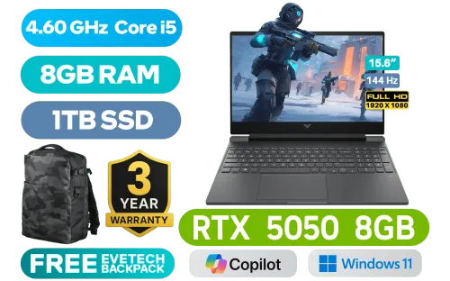 Victus by HP Gaming Laptop 15-fa2013ni 13th Gen Intel® Core™ i5-13420H up to 4.60GHz Processor, 12MB Cache, 8x Cores, 12x Threads / 8GB DDR5 RAM / 1TB Ultra-Fast NVME SSD / 15.6" FHD (1920x1080) Anti-glare 144Hz Refresh Rate with IPS-Level micro-edge Display / NVIDIA GeForce RTX 5050 8GB GDDR7 Dedicated Graphics / Windows 11 Home 64bit / Realtek Wi-Fi 6 8852BE Wireless LAN / Bluetooth 5.4 / HP Wide Vision 720p Camera with Integrated Dual Array Digital Microphone / 2x USB Type-A / 1x USB Type-C / 1x HDMI 2.1 / 1x Headphone and Microphone Combo Jack / 1x RJ45 / White Backlit Keyboard / DTS:X® Ultra; Dual speakers; HP Audio Boost / HP Victus 15 Intel Core i5 RTX 5050 Gaming Laptop DealVictus by HP Gaming Laptop 15-fa2013ni 13th Gen Intel® Core™ i5-13420H up to 4.60GHz Processor, 12MB Cache, 8x Cores, 12x Threads / 8GB DDR5 RAM / 1TB Ultra-Fast NVME SSD / 15.6" FHD (1920x1080) Anti-glare 144Hz Refresh Rate with IPS-Level micro-edge Display / NVIDIA GeForce RTX 5050 8GB GDDR7 Dedicated Graphics / Windows 11 Home 64bit / Realtek Wi-Fi 6 8852BE Wireless LAN / Bluetooth 5.4 / HP Wide Vision 720p Camera with Integrated Dual Array Digital Microphone / 2x USB Type-A / 1x USB Type-C / 1x HDMI 2.1 / 1x Headphone and Microphone Combo Jack / 1x RJ45 / White Backlit Keyboard / DTS:X® Ultra; Dual speakers; HP Audio Boost / HP Victus 15 Intel Core i5 RTX 5050 Gaming Laptop Deal [BP5Q0EA/1TB] / 3 YEARS WARRANTY / [+] GET FREE EVETECH DASH Premium Gaming Backpack+ FREE DELIVERY !