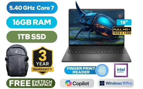 Dell 16 DC16250 1625-2852 Intel® Core™ 7-150U up to 5.40GHz Processor, 12MB Cache, 10x Cores, 12x Threads / 16GB DDR5 RAM / 1TB Ultra-Fast NVME SSD / 16" FHD+ (1920x1200) Anti-glare Display / Integrated Intel Graphics / <span style="font-size: 20px; color: #00BFFF; font-weight: bold;">Windows 11 Professional (64bit)</span> / Realtek RTL8852BE Wi-Fi 6 Wireless LAN / Bluetooth 5.2 / HD Web Camera / Fingerprint Reader / 2x USB Type-A / 1x USB Type-C (10Gbps) with Display Port 1.4 and Power Delivery / 1x HDMI 1.4 / 1x Audio and Headphone Combo Jack / Full Size White Backlit Keyboard / Dell 16 DC16250 Core 7 Laptop DealDell 16 DC16250 1625-2852 Intel® Core™ 7-150U up to 5.40GHz Processor, 12MB Cache, 10x Cores, 12x Threads / 16GB DDR5 RAM / 1TB Ultra-Fast NVME SSD / 16" FHD+ (1920x1200) Anti-glare Display / Integrated Intel Graphics / Windows 11 Professional (64bit) / Realtek RTL8852BE Wi-Fi 6 Wireless LAN / Bluetooth 5.2 / HD Web Camera / Fingerprint Reader / 2x USB Type-A / 1x USB Type-C (10Gbps) with Display Port 1.4 and Power Delivery / 1x HDMI 1.4 / 1x Audio and Headphone Combo Jack / Full Size White Backlit Keyboard / Dell 16 DC16250 Core 7 Laptop Deal [NBDEDC16250C716111PE] / 3 YEARS WARRANTY / [+] GET FREE EVETECH FLUX Premium Gaming Backpack+ FREE DELIVERY !