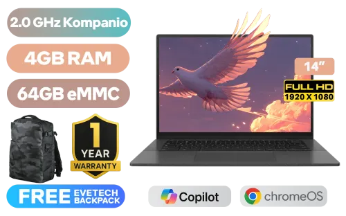 Asus Chromebook CM14 Kompanio 520 up to 2.0GHz Processor, 1MB Cache, 8x Cores / 4GB LPDDR4X RAM / 64GB eMMC / 14" FHD (1920 x 1080) Anti-Glare Display / Integrated ARM Mali-G52 MC2 Graphics / Chrome OS™ / MediaTek Wi-Fi 6 MT79215 Wireless LAN / Bluetooth 5.4 / 720P HD Camera with Privacy Shutter / 1 x USB Type-A / 2x USB Type-C / 1 x Headphone and Microphone Combo Jack / 1x MicroSD Card Reader / Standard Chicklet Keyboard / Built-In Speaker & Microphone / 1 Year Warranty / Asus Chromebook CM14 Kompanio Laptop DealAsus Chromebook CM14 Kompanio 520 up to 2.0GHz Processor, 1MB Cache, 8x Cores / 4GB LPDDR4X RAM / 64GB eMMC / 14" FHD (1920 x 1080) Anti-Glare Display / Integrated ARM Mali-G52 MC2 Graphics / Chrome OS™ / MediaTek Wi-Fi 6 MT79215 Wireless LAN / Bluetooth 5.4 / 720P HD Camera with Privacy Shutter / 1 x USB Type-A / 2x USB Type-C / 1 x Headphone and Microphone Combo Jack / 1x MicroSD Card Reader / Standard Chicklet Keyboard / Built-In Speaker & Microphone / 1 Year Warranty / Asus Chromebook CM14 Kompanio Laptop Deal [CM1402CM2A-NK0242] / [+] GET FREE EVETECH DASH Premium Gaming Backpack+ FREE DELIVERY !