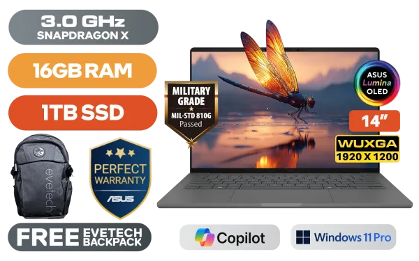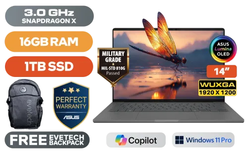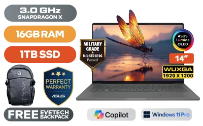 ASUS ZenBook A14 UX3407QA Qualcomm Snapdragon® X X1-26-100 Up to 3.0GHz Processor, 30MB Cache, 8x Cores, 8x Threads / 16GB LPDDR5X RAM / 1TB Ultra-Fast NVMe SSD / 14" WUXGA (1920 x 1200) OLED Display / Integrated Qualcomm® Adreno™ Graphics Card / <span style="font-size: 20px; color: #00BFFF; font-weight: bold;">Windows 11 Professional (64bit)</span> / Qualcomm FastConnect 6900 Wi-Fi 6E DBS Wireless LAN / Bluetooth 5.3 / FHD IR Web Camera/ 1x Type-A / 2x USB Type-C (DisplayPort / power delivery) / 1x HDMI / 1x Headphone & Microphone Combo Jack / White Backlit Chiclet Keyboard / Smart Amp Technology Audio / Free Asus Sleeve / ASUS ZenBook A14 UX3407QA Snapdragon® X Laptop DealASUS ZenBook A14 UX3407QA Qualcomm Snapdragon® X X1-26-100 Up to 3.0GHz Processor, 30MB Cache, 8x Cores, 8x Threads / 16GB LPDDR5X RAM / 1TB Ultra-Fast NVMe SSD / 14" WUXGA (1920 x 1200) OLED Display / Integrated Qualcomm® Adreno™ Graphics Card / Windows 11 Professional (64bit) / Qualcomm FastConnect 6900 Wi-Fi 6E DBS Wireless LAN / Bluetooth 5.3 / FHD IR Web Camera/ 1x Type-A / 2x USB Type-C (DisplayPort / power delivery) / 1x HDMI / 1x Headphone & Microphone Combo Jack / White Backlit Chiclet Keyboard / Smart Amp Technology Audio / Free Asus Sleeve / ASUS ZenBook A14 UX3407QA Snapdragon® X Laptop Deal [UX3407QA-OQ1610G0X] / 3 YEARS WARRANTY / [+] GET FREE EVETECH FLUX Premium Gaming Backpack+ FREE DELIVERY !