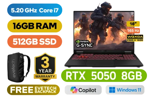 [G-SYNC] ASUS TUF Gaming F16 FX608JHR 14th Gen Intel® Core™ i7-14650HX up to 5.20GHz Processor, 30MB Cache, 16x Cores, 24x Threads / 16GB DDR5 RAM / 512GB Ultra-Fast NVMe SSD / 16" WQXGA(2560x1600) 165Hz, Anti-Glare IPS-Level Display / NVIDIA 50 Series GeForce RTX 5050 8GB GDDR7 Dedicated Graphics / Windows 11 Home (64bit) / Realtek Wi-Fi 6E 8852CE Wireless LAN / Bluetooth 5.3 / 1080P FHD IR Camera / 3 x USB Type-A / 2x USB Type-C (Supports Thunderbolt 4 / DisplayPort) / 1 x HDMI / 1x Microphone and Headphone Combo jack / 1x RJ-45 / RGB Backlit Chiclet Keyboard / Dolby Atmos Audio with AI noise-canceling / ASUS TUF Gaming F16 Intel Core i7 RTX 5050 Gaming Laptop Deal[G-SYNC] ASUS TUF Gaming F16 FX608JHR 14th Gen Intel® Core™ i7-14650HX up to 5.20GHz Processor, 30MB Cache, 16x Cores, 24x Threads / 16GB DDR5 RAM / 512GB Ultra-Fast NVMe SSD / 16" WQXGA(2560x1600) 165Hz, Anti-Glare IPS-Level Display / NVIDIA 50 Series GeForce RTX 5050 8GB GDDR7 Dedicated Graphics / Windows 11 Home (64bit) / Realtek Wi-Fi 6E 8852CE Wireless LAN / Bluetooth 5.3 / 1080P FHD IR Camera / 3 x USB Type-A / 2x USB Type-C (Supports Thunderbolt 4 / DisplayPort) / 1 x HDMI / 1x Microphone and Headphone Combo jack / 1x RJ-45 / RGB Backlit Chiclet Keyboard / Dolby Atmos Audio with AI noise-canceling / ASUS TUF Gaming F16 Intel Core i7 RTX 5050 Gaming Laptop Deal [FX608JHR-I716512G0W] / 3 YEARS WARRANTY / [+] GET FREE EVETECH NEO Premium Gaming Backpack+ FREE DELIVERY !