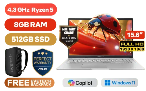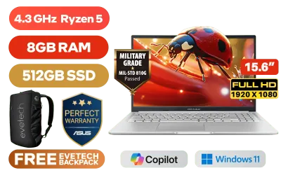 ASUS Vivobook 15 M1502YA AMD Ryzen 5 7430U Up to 4.3GHz Processor, 19MB Cache, 6x Cores, 12x Threads / 8GB DDR4 RAM / 512GB Ultra-Fast NVMe SSD / 15.6" FHD (1920 x 1080) Anti-Glare IPS-Level Display / Integrated AMD Radeon Graphics / Windows 11 Home (64bit) / MediaTek MT7902 Wi-Fi 6E Wireless LAN / Bluetooth 5.3 / 720p HD Web Camera With Privacy Shutter / 3x USB Type-A / 1x USB Type-C (Support Power Delivery) / 1x HDMI / 1 x Headphone & Microphone Audio Combo Jack / White Backlit Chicklet Keyboard / SonicMaster Audio / ASUS Vivobook 15 M1502YA AMD Ryzen 5 Laptop DealASUS Vivobook 15 M1502YA AMD Ryzen 5 7430U Up to 4.3GHz Processor, 19MB Cache, 6x Cores, 12x Threads / 8GB DDR4 RAM / 512GB Ultra-Fast NVMe SSD / 15.6" FHD (1920 x 1080) Anti-Glare IPS-Level Display / Integrated AMD Radeon Graphics / Windows 11 Home (64bit) / MediaTek MT7902 Wi-Fi 6E Wireless LAN / Bluetooth 5.3 / 720p HD Web Camera With Privacy Shutter / 3x USB Type-A / 1x USB Type-C (Support Power Delivery) / 1x HDMI / 1 x Headphone & Microphone Audio Combo Jack / White Backlit Chicklet Keyboard / SonicMaster Audio / ASUS Vivobook 15 M1502YA AMD Ryzen 5 Laptop Deal [M1502YA-58512S2W] / 3 YEARS WARRANTY / [+] GET FREE EVETECH NEO Premium Gaming Backpack+ FREE DELIVERY !