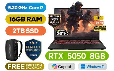 [G-SYNC] ASUS TUF Gaming F16 FX608JHR 14th Gen Intel® Core™ i7-14650HX up to 5.20GHz Processor, 30MB Cache, 16x Cores, 24x Threads / 16GB DDR5 RAM / 2TB Ultra-Fast NVMe SSD / 16" WQXGA(2560x1600) 165Hz, Anti-Glare IPS-Level Display / NVIDIA 50 Series GeForce RTX 5050 8GB GDDR7 Dedicated Graphics / Windows 11 Home (64bit) / Realtek Wi-Fi 6E 8852CE Wireless LAN / Bluetooth 5.3 / 1080P FHD IR Camera / 3 x USB Type-A / 2x USB Type-C (Supports Thunderbolt 4 / DisplayPort) / 1 x HDMI / 1x Microphone and Headphone Combo jack / 1x RJ-45 / RGB Backlit Chiclet Keyboard / Dolby Atmos Audio with AI noise-canceling / ASUS TUF Gaming F16 Intel Core i7 RTX 5050 Gaming Laptop Deal[G-SYNC] ASUS TUF Gaming F16 FX608JHR 14th Gen Intel® Core™ i7-14650HX up to 5.20GHz Processor, 30MB Cache, 16x Cores, 24x Threads / 16GB DDR5 RAM / 2TB Ultra-Fast NVMe SSD / 16" WQXGA(2560x1600) 165Hz, Anti-Glare IPS-Level Display / NVIDIA 50 Series GeForce RTX 5050 8GB GDDR7 Dedicated Graphics / Windows 11 Home (64bit) / Realtek Wi-Fi 6E 8852CE Wireless LAN / Bluetooth 5.3 / 1080P FHD IR Camera / 3 x USB Type-A / 2x USB Type-C (Supports Thunderbolt 4 / DisplayPort) / 1 x HDMI / 1x Microphone and Headphone Combo jack / 1x RJ-45 / RGB Backlit Chiclet Keyboard / Dolby Atmos Audio with AI noise-canceling / ASUS TUF Gaming F16 Intel Core i7 RTX 5050 Gaming Laptop Deal [FX608JHR-I716512G0W/2TB] / 3 YEARS WARRANTY / [+] GET FREE EVETECH NEO Premium Gaming Backpack+ FREE DELIVERY !