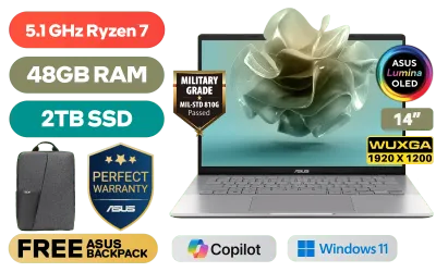 ASUS Vivobook S14 M3407HA AMD Ryzen 7 260 up to 5.1GHz Processor, 24MB Cache, 8x Cores, 16x Threads / 48GB DDR5 RAM / 2TB Ultra-Fast NVMe SSD / 14" WUXGA (1920 x 1200) OLED Display / Integrated AMD Radeon™ Graphics / Windows 11 Home (64bit) / Realtek Wi-Fi 6 8852BE Wireless LAN / Bluetooth 5.3 / FHD 1080p IR Web Camera / 2x USB Type-A / 2x USB Type-C (Supports DisplayPort / Power Delivery) / 1 x HDMI / 1x Microphone and Headphone Combo Jack / White Backlit Keyboard / Built-in Speaker and Microphone / Free ASUS Backpack/ ASUS Vivobook S14 M3407HA OLED Ryzen 7 DealASUS Vivobook S14 M3407HA AMD Ryzen 7 260 up to 5.1GHz Processor, 24MB Cache, 8x Cores, 16x Threads / 48GB DDR5 RAM / 2TB Ultra-Fast NVMe SSD / 14" WUXGA (1920 x 1200) OLED Display / Integrated AMD Radeon™ Graphics / Windows 11 Home (64bit) / Realtek Wi-Fi 6 8852BE Wireless LAN / Bluetooth 5.3 / FHD 1080p IR Web Camera / 2x USB Type-A / 2x USB Type-C (Supports DisplayPort / Power Delivery) / 1 x HDMI / 1x Microphone and Headphone Combo Jack / White Backlit Keyboard / Built-in Speaker and Microphone / Free ASUS Backpack/ ASUS Vivobook S14 M3407HA OLED Ryzen 7 Deal [M3407HA-O71610S0W/48GB/2TB] / 3 YEARS WARRANTY + FREE DELIVERY !