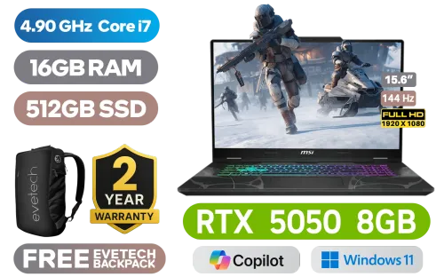 MSI Cyborg 15 B13WEKG Intel Core i7-13620H up to 4.90GHz Processor, 24MB Cache, 10x Cores, 16x Threads / 16GB DDR5 RAM / 512GB Ultra-Fast NVMe SSD / 15.6" FHD (1920 x 1080) 144Hz IPS-Level Display / NVIDIA GeForce RTX 5050 GDDR7 8GB Graphics / Windows 11 Home / Intel Wi-Fi 6E AX211 Wireless LAN / Bluetooth 5.3 / 720p HD Camera with Privacy Shutter / 2x USB Type-A / 1x USB Type-C (Supports DisplayPort / Power Delivery 3.0) / 1x HDMI / 1x RJ-45 / 1x Headphone & Microphone Combo Jack / RGB Backlit Gaming Keyboard / 2x 2W Speakers / 2 Years Warranty / MSI Cyborg 15 B13WEKG Intel Core i7 Gaming LaptopMSI Cyborg 15 B13WEKG Intel Core i7-13620H up to 4.90GHz Processor, 24MB Cache, 10x Cores, 16x Threads / 16GB DDR5 RAM / 512GB Ultra-Fast NVMe SSD / 15.6" FHD (1920 x 1080) 144Hz IPS-Level Display / NVIDIA GeForce RTX 5050 GDDR7 8GB Graphics / Windows 11 Home / Intel Wi-Fi 6E AX211 Wireless LAN / Bluetooth 5.3 / 720p HD Camera with Privacy Shutter / 2x USB Type-A / 1x USB Type-C (Supports DisplayPort / Power Delivery 3.0) / 1x HDMI / 1x RJ-45 / 1x Headphone & Microphone Combo Jack / RGB Backlit Gaming Keyboard / 2x 2W Speakers / 2 Years Warranty / MSI Cyborg 15 B13WEKG Intel Core i7 Gaming Laptop [Cyborg-15-B13WEKG-474ZA] / [+] GET FREE EVETECH NEO Premium Gaming Backpack+ FREE DELIVERY !