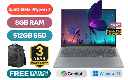 LENOVO IDEAPAD SLIM 3 15ABR8 AMD Ryzen 7 7730U up to 4.50GHz Processor, 20MB Cache, 8x Cores, 16x Threads / 8GB DDR4 RAM / 512GB Ultra-Fast NVME SSD / 15.6" FHD (1920 x 1080) Anti-glare Display / Integrated AMD Radeon Graphics / Windows 11 Home / WiFi 6 Wireless LAN / Bluetooth 5.2 / HD 720p Web Camera With Privacy Shutter / 2x USB 3.2 Gen 1 / 1x USB-C 3.2 Gen 1 / 1x HDMI / 1x Headphone & Microphone Audio Combo Jack / 1x SD Card reader / Non-backlit English Keyboard / Lenovo IdeaPad Slim 3 15ABR8 AMD Ryzen 7 Laptop DealLENOVO IDEAPAD SLIM 3 15ABR8 AMD Ryzen 7 7730U up to 4.50GHz Processor, 20MB Cache, 8x Cores, 16x Threads / 8GB DDR4 RAM / 512GB Ultra-Fast NVME SSD / 15.6" FHD (1920 x 1080) Anti-glare Display / Integrated AMD Radeon Graphics / Windows 11 Home / WiFi 6 Wireless LAN / Bluetooth 5.2 / HD 720p Web Camera With Privacy Shutter / 2x USB 3.2 Gen 1 / 1x USB-C 3.2 Gen 1 / 1x HDMI / 1x Headphone & Microphone Audio Combo Jack / 1x SD Card reader / Non-backlit English Keyboard / Lenovo IdeaPad Slim 3 15ABR8 AMD Ryzen 7 Laptop Deal [82XM00KFSA] / [+] GET FREE EVETECH DASH Premium Gaming Backpack / 3 YEARS WARRANTY + FREE DELIVERY !
