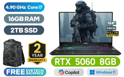 MSI Cyborg 15 B13WFKG Intel Core i7-13620H up to 4.90GHz Processor, 24MB Cache, 10x Cores, 16x Threads / 16GB DDR5 RAM / 2TB NVMe PCIe SSD / 15.6" Full HD (1920 x 1080) 144Hz IPS-Level Display / NVIDIA GeForce RTX 5060 GDDR7 8GB Graphics / Windows 11 Home / Intel Wi-Fi 6E AX211 Wireless LAN / Bluetooth 5.3 / 720p HD Webcam / 2x USB Type-A / 1x USB Type-C (Supports DisplayPort / Power Delivery 3.0) / 1x HDMI / 1x RJ-45 Ethernet LAN / 1x Headphone & Microphone Combo Jack / Kensington Lock / 4-Zone RGB Gaming Keyboard / 2x 2W Speakers / 2-Year Warranty / MSI Cyborg 15 B13WFKG Intel Core i7 RTX 5060 Gaming LaptopMSI Cyborg 15 B13WFKG Intel Core i7-13620H up to 4.90GHz Processor, 24MB Cache, 10x Cores, 16x Threads / 16GB DDR5 RAM / 2TB NVMe PCIe SSD / 15.6" Full HD (1920 x 1080) 144Hz IPS-Level Display / NVIDIA GeForce RTX 5060 GDDR7 8GB Graphics / Windows 11 Home / Intel Wi-Fi 6E AX211 Wireless LAN / Bluetooth 5.3 / 720p HD Webcam / 2x USB Type-A / 1x USB Type-C (Supports DisplayPort / Power Delivery 3.0) / 1x HDMI / 1x RJ-45 Ethernet LAN / 1x Headphone & Microphone Combo Jack / Kensington Lock / 4-Zone RGB Gaming Keyboard / 2x 2W Speakers / 2-Year Warranty / MSI Cyborg 15 B13WFKG Intel Core i7 RTX 5060 Gaming Laptop [Cyborg-15-B13WFKG-473ZA/2TB] / [+] GET FREE EVETECH DASH Premium Gaming Backpack+ FREE DELIVERY !