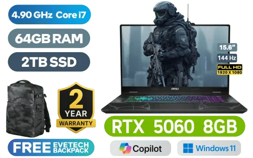 MSI Cyborg 15 B13WFKG Intel Core i7-13620H up to 4.90GHz Processor, 24MB Cache, 10x Cores, 16x Threads / 64GB DDR5 RAM / 2TB NVMe PCIe SSD / 15.6" Full HD (1920 x 1080) 144Hz IPS-Level Display / NVIDIA GeForce RTX 5060 GDDR7 8GB Graphics / Windows 11 Home / Intel Wi-Fi 6E AX211 Wireless LAN / Bluetooth 5.3 / 720p HD Webcam / 2x USB Type-A / 1x USB Type-C (Supports DisplayPort / Power Delivery 3.0) / 1x HDMI / 1x RJ-45 Ethernet LAN / 1x Headphone & Microphone Combo Jack / Kensington Lock / 4-Zone RGB Gaming Keyboard / 2x 2W Speakers / 2-Year Warranty / MSI Cyborg 15 B13WFKG Intel Core i7 RTX 5060 Gaming LaptopMSI Cyborg 15 B13WFKG Intel Core i7-13620H up to 4.90GHz Processor, 24MB Cache, 10x Cores, 16x Threads / 64GB DDR5 RAM / 2TB NVMe PCIe SSD / 15.6" Full HD (1920 x 1080) 144Hz IPS-Level Display / NVIDIA GeForce RTX 5060 GDDR7 8GB Graphics / Windows 11 Home / Intel Wi-Fi 6E AX211 Wireless LAN / Bluetooth 5.3 / 720p HD Webcam / 2x USB Type-A / 1x USB Type-C (Supports DisplayPort / Power Delivery 3.0) / 1x HDMI / 1x RJ-45 Ethernet LAN / 1x Headphone & Microphone Combo Jack / Kensington Lock / 4-Zone RGB Gaming Keyboard / 2x 2W Speakers / 2-Year Warranty / MSI Cyborg 15 B13WFKG Intel Core i7 RTX 5060 Gaming Laptop [Cyborg-15-B13WFKG-473ZA/64GB/2TB] / [+] GET FREE EVETECH DASH Premium Gaming Backpack+ FREE DELIVERY !