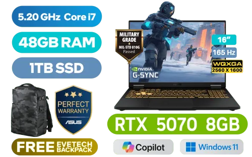[G-SYNC] ASUS TUF Gaming F16 FX608JPR 14th Gen Intel Core i7-14650HX up to 5.20GHz Processor, 30MB Cache, 16x Cores, 24x Threads / 48GB DDR5 RAM / 1TB Ultra-Fast NVMe SSD / 16" WQXGA (2560 x 1600) 165Hz, IPS-level Display / NVIDIA GeForce RTX 5070 8GB GDDR7 Dedicated Graphics / Windows 11 Home (64bit) / Intel Wi-Fi 6 AX211 Wireless LAN / Bluetooth 5.4 / 1080P FHD IR Camera / 3x USB Type-A / 2x USB Type-C (Supports Thunderbolt 4 / DisplayPort™) / 1x Headphone & Microphone Combo Jack / 1x HDMI / 1x RJ-45 / RGB Backlit Keyboard / Dolby Atmos Audio system with AI noise-cancelling / ASUS TUF Gaming F16 FX608JPR Intel Core i7 RTX 5070 Gaming Laptop[G-SYNC] ASUS TUF Gaming F16 FX608JPR 14th Gen Intel Core i7-14650HX up to 5.20GHz Processor, 30MB Cache, 16x Cores, 24x Threads / 48GB DDR5 RAM / 1TB Ultra-Fast NVMe SSD / 16" WQXGA (2560 x 1600) 165Hz, IPS-level Display / NVIDIA GeForce RTX 5070 8GB GDDR7 Dedicated Graphics / Windows 11 Home (64bit) / Intel Wi-Fi 6 AX211 Wireless LAN / Bluetooth 5.4 / 1080P FHD IR Camera / 3x USB Type-A / 2x USB Type-C (Supports Thunderbolt 4 / DisplayPort™) / 1x Headphone & Microphone Combo Jack / 1x HDMI / 1x RJ-45 / RGB Backlit Keyboard / Dolby Atmos Audio system with AI noise-cancelling / ASUS TUF Gaming F16 FX608JPR Intel Core i7 RTX 5070 Gaming Laptop [FX608JPR-I71610G0W/48GB] / [+] GET FREE EVETECH DASH Premium Gaming Backpack / 3 YEARS WARRANTY / [+]Get Resident Evil: Requiem with select GeForce RTX 50 Series (Standard Edition)+ FREE DELIVERY !