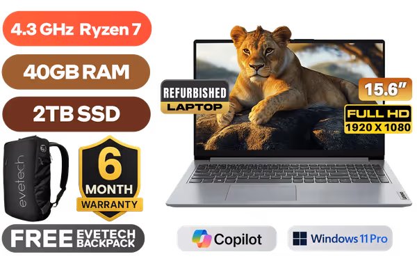 [Refurbished] Lenovo IdeaPad 1 15ALC7 AMD Ryzen 7-5700U up to 4.3GHz Processor, 12MB Cache, 8x Cores, 16x Threads / 40GB DDR4 RAM / 2TB Ultra-Fast NVME SSD / 15.6" FHD (1920x1080) Anti-Glare Display / Integrated AMD Radeon Graphics / <span style="font-size: 20px; color: #00BFFF; font-weight: bold;">Windows 11 Professional (64bit)</span> / 720p HD Camera with Privacy Shutter/ MediaTek Wi-Fi 6 MT7921 LAN / Bluetooth 5.2 / 2x USB Type-A / 1x USB Type-C / 1x HDMI / 1x SD Card Reader / 1x Headphone & Microphone Combo Jack / 2x Stereo Speakers With Dolby Audio / Non-Backlit Keyboard / 6 Month Warranty / Lenovo IdeaPad 1 15ALC7 Ryzen 7 Laptop Deal[Refurbished] Lenovo IdeaPad 1 15ALC7 AMD Ryzen 7-5700U up to 4.3GHz Processor, 12MB Cache, 8x Cores, 16x Threads / 40GB DDR4 RAM / 2TB Ultra-Fast NVME SSD / 15.6" FHD (1920x1080) Anti-Glare Display / Integrated AMD Radeon Graphics / Windows 11 Professional (64bit) / 720p HD Camera with Privacy Shutter/ MediaTek Wi-Fi 6 MT7921 LAN / Bluetooth 5.2 / 2x USB Type-A / 1x USB Type-C / 1x HDMI / 1x SD Card Reader / 1x Headphone & Microphone Combo Jack / 2x Stereo Speakers With Dolby Audio / Non-Backlit Keyboard / 6 Month Warranty / Lenovo IdeaPad 1 15ALC7 Ryzen 7 Laptop Deal [REFURB-82R400N2FU/40GB/2TB] / [+] GET FREE EVETECH NEO Premium Gaming Backpack+ FREE DELIVERY !