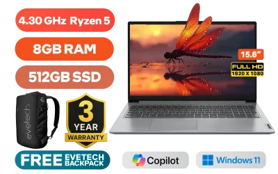 LENOVO IDEAPAD 1 15AMN7 AMD Ryzen 5 7520U up to 4.30GHz Processor, 6MB Cache, 4x Cores, 8x Threads / 8GB LPDDR5 RAM / 512GB Ultra-Fast NVME SSD / 15.6" FHD (1920x1080) Anti-glare Display / Integrated AMD Radeon Graphics / Windows 11 Home / WiFi 6 Wireless LAN / Bluetooth 5.2 / HD 720p Web Camera with Privacy Shutter / 2x USB Type-A / 1x USB Type-C / 1x HDMI / 1x Headphone & microphone combo jack / 1x SD Card reader / Non-backlit English Keyboard / Stereo Speakers with Dolby Audio / Lenovo IdeaPad 1 15AMN7 AMD Ryzen 5 Laptop DealLENOVO IDEAPAD 1 15AMN7 AMD Ryzen 5 7520U up to 4.30GHz Processor, 6MB Cache, 4x Cores, 8x Threads / 8GB LPDDR5 RAM / 512GB Ultra-Fast NVME SSD / 15.6" FHD (1920x1080) Anti-glare Display / Integrated AMD Radeon Graphics / Windows 11 Home / WiFi 6 Wireless LAN / Bluetooth 5.2 / HD 720p Web Camera with Privacy Shutter / 2x USB Type-A / 1x USB Type-C / 1x HDMI / 1x Headphone & microphone combo jack / 1x SD Card reader / Non-backlit English Keyboard / Stereo Speakers with Dolby Audio / Lenovo IdeaPad 1 15AMN7 AMD Ryzen 5 Laptop Deal [82VG00X2SA] / 3 YEARS WARRANTY / [+] GET FREE EVETECH DASH Premium Gaming Backpack+ FREE DELIVERY !