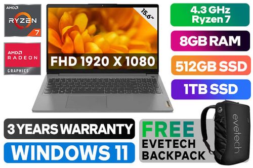 Lenovo IdeaPad 3 15ALC6 82KU018SSA AMD Ryzen 7 5700U up to 4.3GHz Processor with AMD Max Boost Clock Technology, 12MB Cache, 8x Cores, 16x Threads / 8GB DDR4 RAM / 512GB Ultra-Fast NVME SSD + 1TB Hard Drive / 15.6" FHD 1920x1080 Anti-Glare Display / Integrated AMD Radeon™ Graphics, DirectX 12 Support / No DVD Drive Included / Windows 11 Home (64bit)</span> / HD 720p with Privacy Shutter Microphone / Bluetooth 5.0 / Dual Band 802.11ac Wireless LAN / 2x 1.5W Speaker With Dolby Audio / Headphone Audio & Microphone Combo Jack / 2x USB Type-A / 1x USB Type-C / 1x HDMI / 1x SD Card Reader / Non-Backlit Keyboard / Supports battery Quick charge: approximately 80% in 1 Hour / Lenovo IdeaPad 3 15ALC6 Ryzen 7 Laptop DealLenovo IdeaPad 3 15ALC6 82KU018SSA AMD Ryzen 7 5700U up to 4.3GHz Processor with AMD Max Boost Clock Technology, 12MB Cache, 8x Cores, 16x Threads / 8GB DDR4 RAM / 512GB Ultra-Fast NVME SSD + 1TB Hard Drive / 15.6" FHD 1920x1080 Anti-Glare Display / Integrated AMD Radeon™ Graphics, DirectX 12 Support / No DVD Drive Included / Windows 11 Home (64bit) / HD 720p with Privacy Shutter Microphone / Bluetooth 5.0 / Dual Band 802.11ac Wireless LAN / 2x 1.5W Speaker With Dolby Audio / Headphone Audio & Microphone Combo Jack / 2x USB Type-A / 1x USB Type-C / 1x HDMI / 1x SD Card Reader / Non-Backlit Keyboard / Supports battery Quick charge: approximately 80% in 1 Hour / Lenovo IdeaPad 3 15ALC6 Ryzen 7 Laptop Deal [82KU018SSA/512GB] / 3 YEARS WARRANTY / [+] GET FREE EVETECH NEO Premium Gaming Backpack+ FREE DELIVERY !