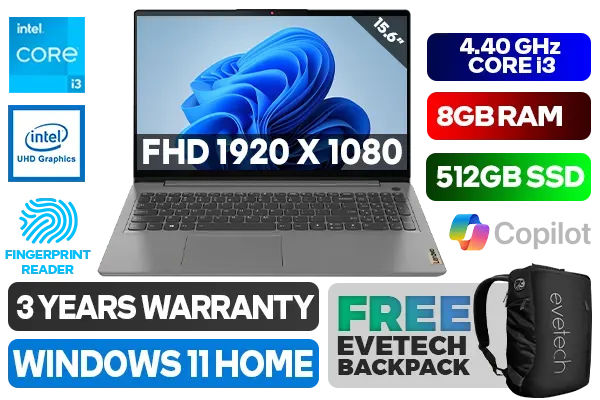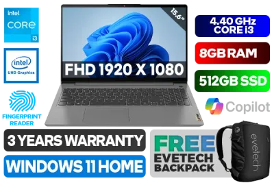 Lenovo IdeaPad 3 15IAU7 82RK00JWSA 12th Gen Intel Core i3-1215U up to 4.40GHz Processor, 10MB Cache, 6x Cores, 8x Threads / 8GB DDR4 RAM / 512GB Ultra-Fast NVME SSD / 15.6" FHD 1920x1080 Refresh-rate Anti-Glare Display / Integrated Intel UHD Graphics / No DVD Drive Included / Windows 11 Home (64bit) / HD 720p with Privacy Shutter Microphone / Bluetooth 5.0 / Intel® Wireless-AC 9560 / 2x 1.5W Speaker With Dolby Audio / Headphone Audio & Microphone Combo Jack / 2x USB Type-A / 1x USB Type-C / 1x HDMI / 1x SD Card Reader / White Backlit Keyboard / Fingerprint Reader / Supports battery Quick charge: approximately 80% in 1 Hour / Lenovo IdeaPad 3 15IAU7 Core i3 Laptop DealLenovo IdeaPad 3 15IAU7 82RK00JWSA 12th Gen Intel Core i3-1215U up to 4.40GHz Processor, 10MB Cache, 6x Cores, 8x Threads / 8GB DDR4 RAM / 512GB Ultra-Fast NVME SSD / 15.6" FHD 1920x1080 Refresh-rate Anti-Glare Display / Integrated Intel UHD Graphics / No DVD Drive Included / Windows 11 Home (64bit) / HD 720p with Privacy Shutter Microphone / Bluetooth 5.0 / Intel® Wireless-AC 9560 / 2x 1.5W Speaker With Dolby Audio / Headphone Audio & Microphone Combo Jack / 2x USB Type-A / 1x USB Type-C / 1x HDMI / 1x SD Card Reader / White Backlit Keyboard / Fingerprint Reader / Supports battery Quick charge: approximately 80% in 1 Hour / Lenovo IdeaPad 3 15IAU7 Core i3 Laptop Deal [82RK00JWSA] / 3 YEARS WARRANTY / [+] GET FREE EVETECH NEO Premium Gaming Backpack+ FREE DELIVERY !